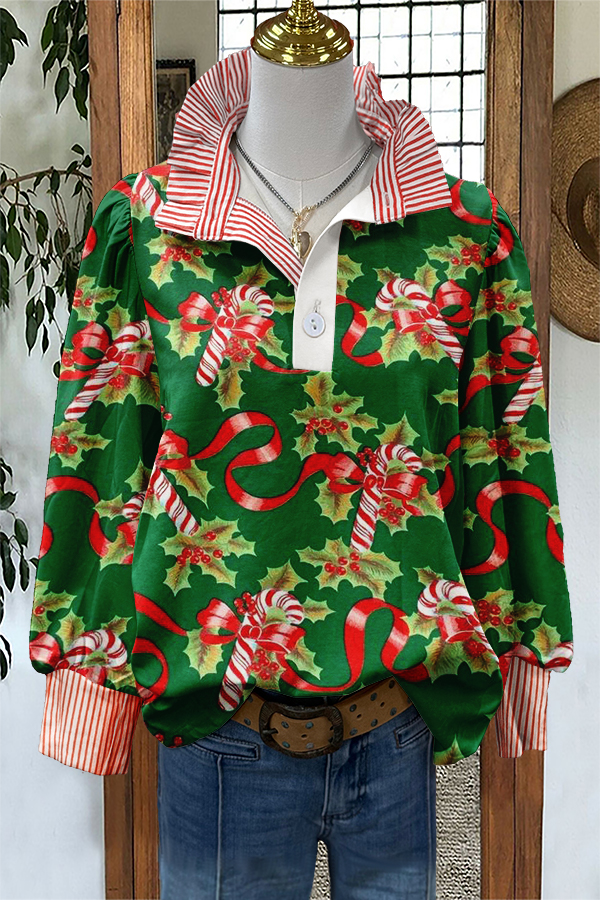 Christmas Candy Canes Print Stripe Puff Sleeve Blouse
