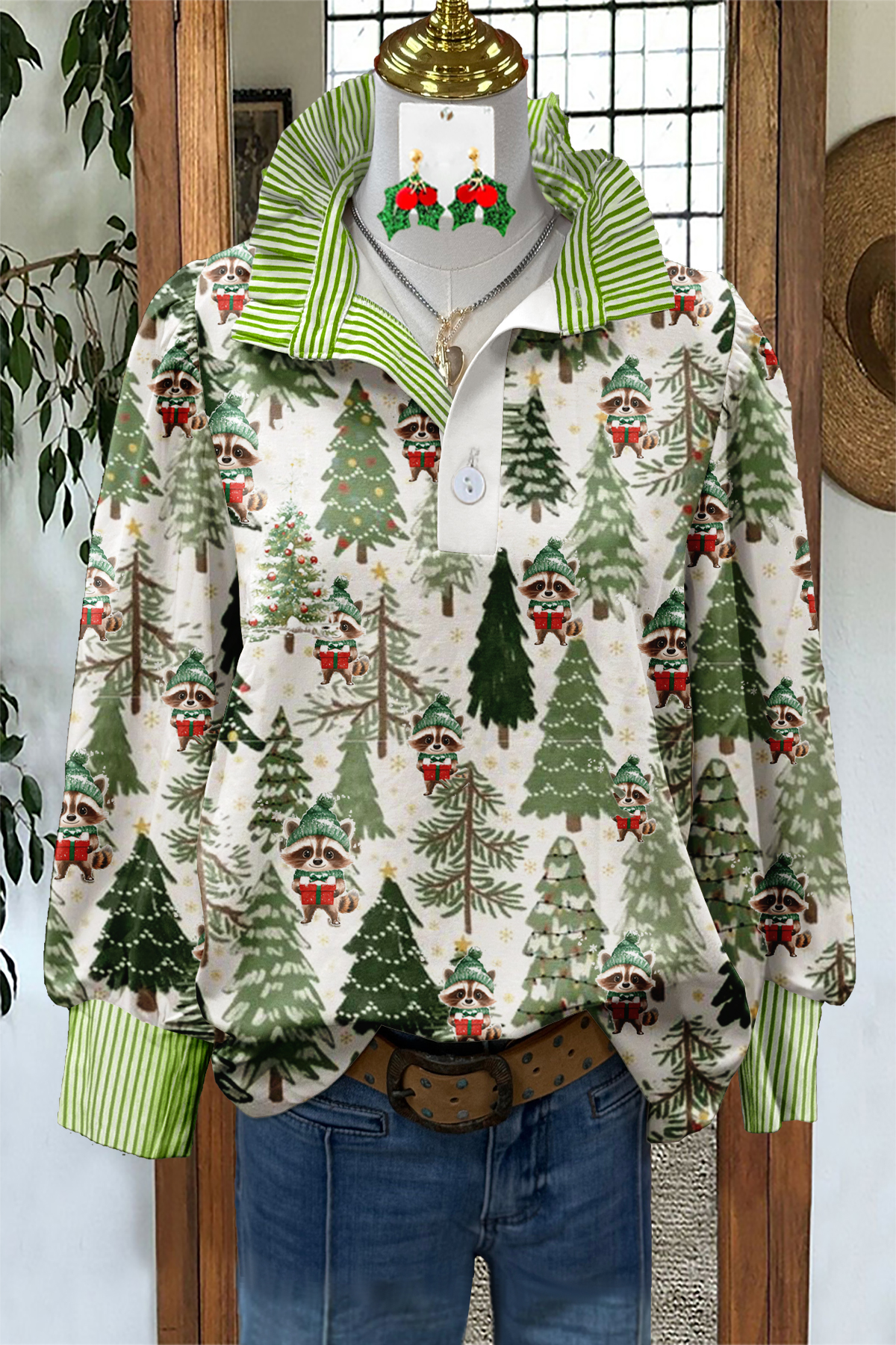 Christmas Raccoon Striped Graphic Print Blouse