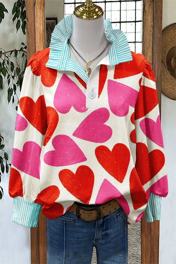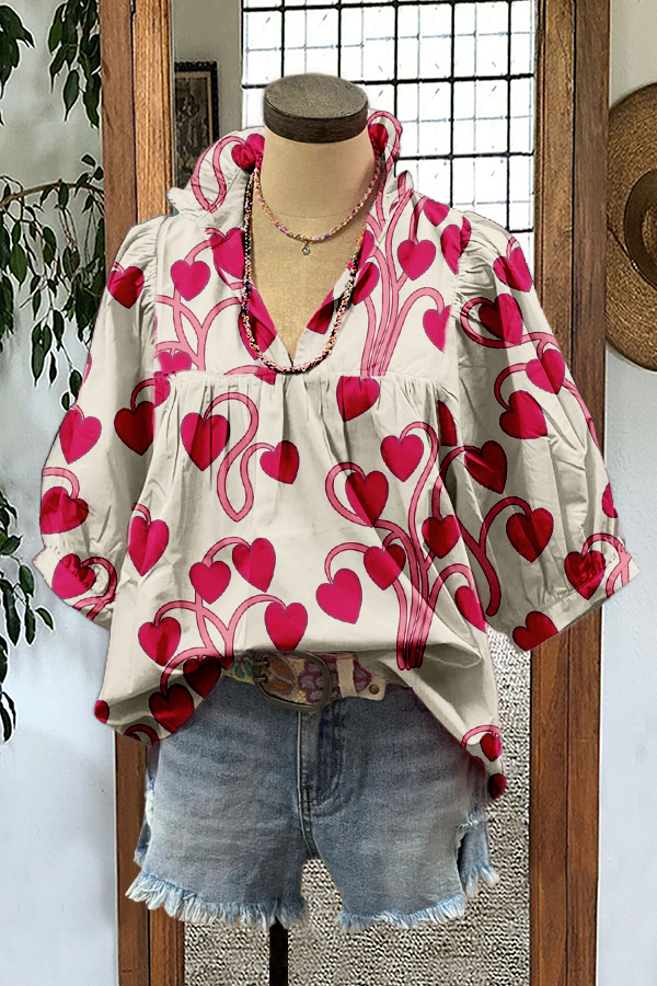 Cute Valentine's Day Print Puff Sleeve Blouse