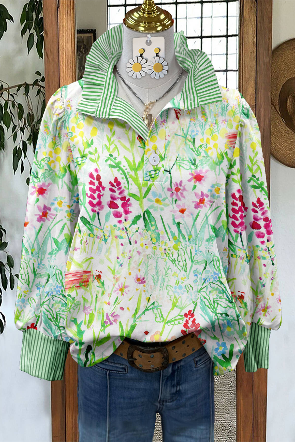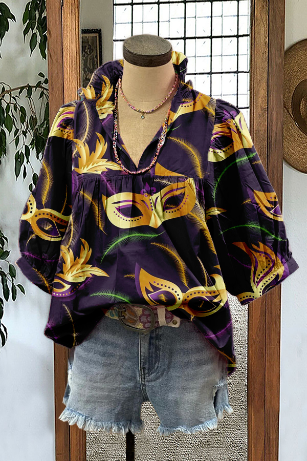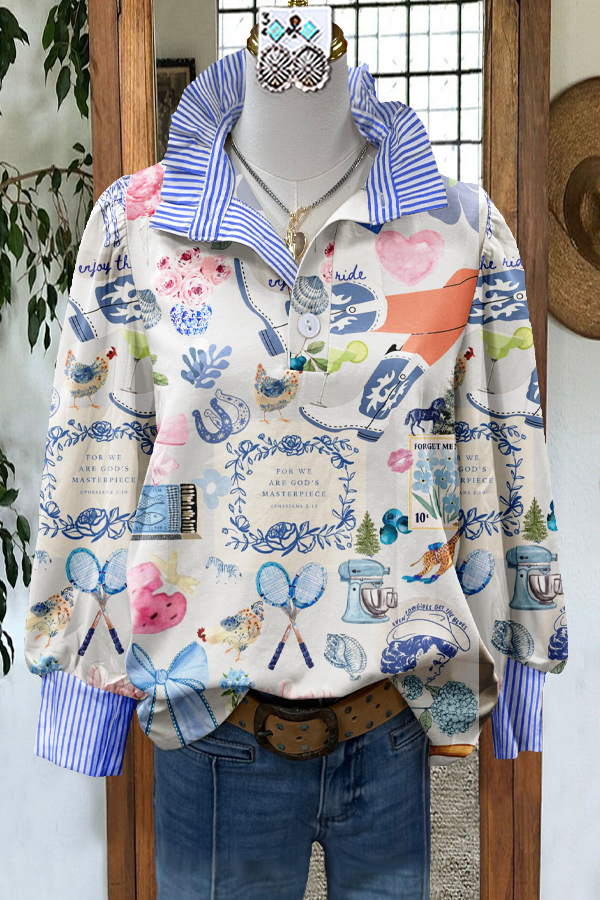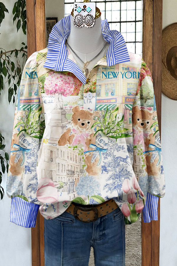 Elegant Contrast Color Stitching Graphic Print Blouse