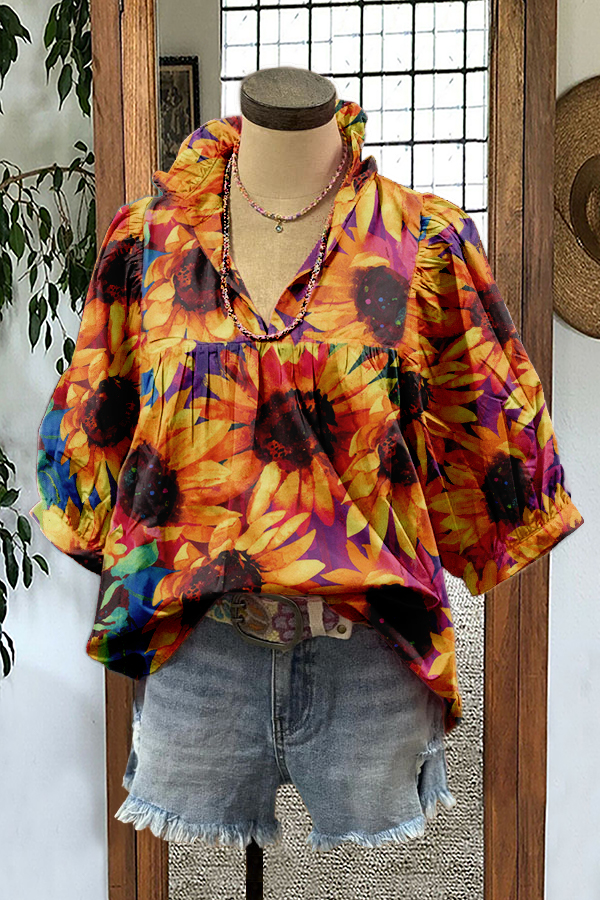 Stylish Sunflower Floral Print Puff Sleeve Blouse