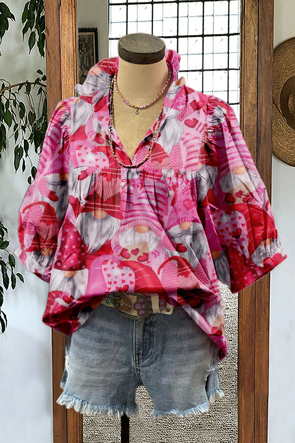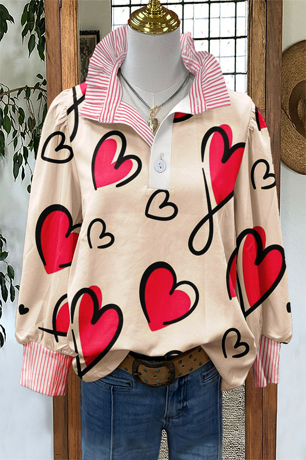 Cute Valentine's Day Print Puff Sleeve Blouse