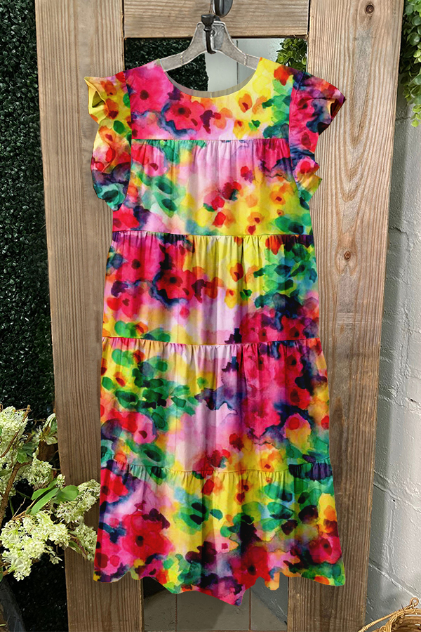 Cute Psychedelic Floral Print Ruffled Pleated Dress