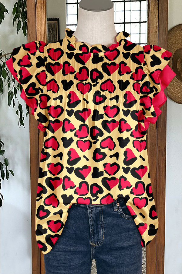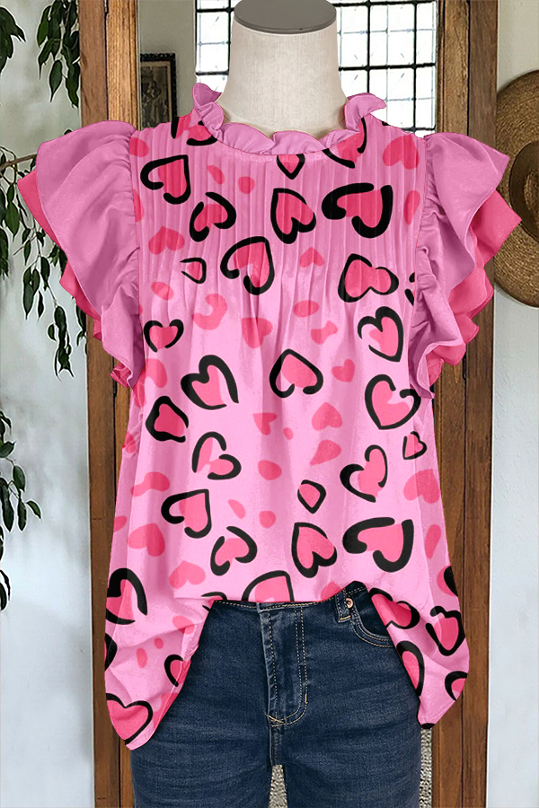 Cute Valentine's Day Heart Print Ruffled Sleeve Paneled Pleated Blouse