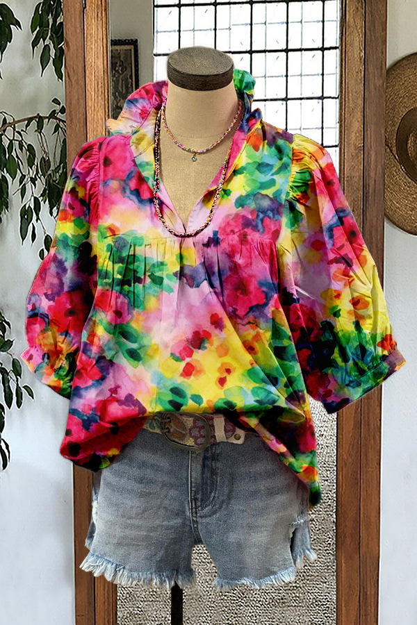 Unique Psychedelic Floral Print Puff Sleeve Blouse