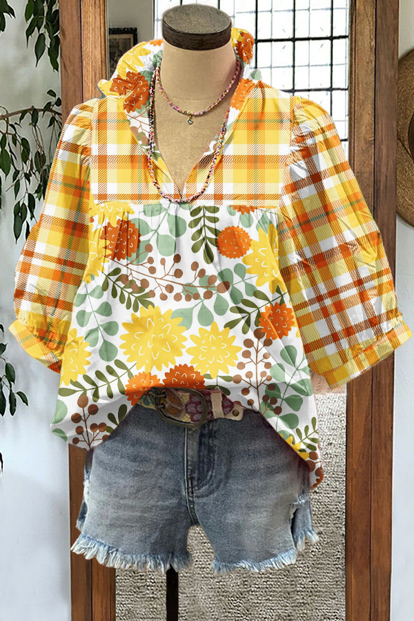 Classic Botanical Print Pleated Fly Sleeve Blouse