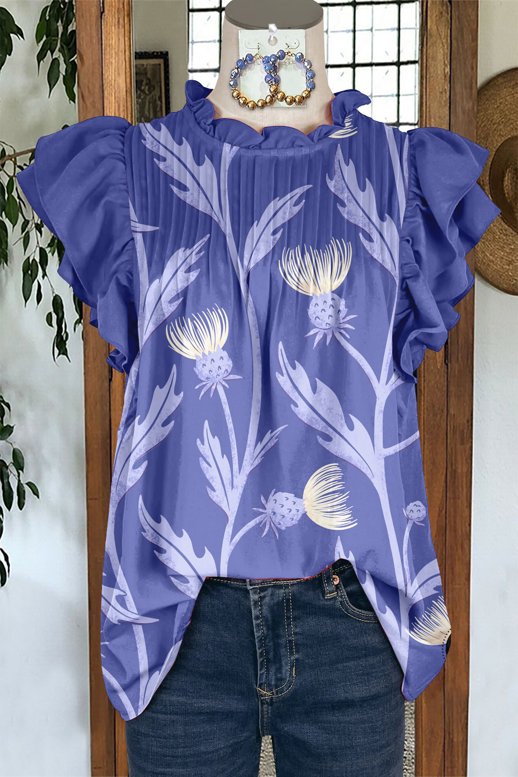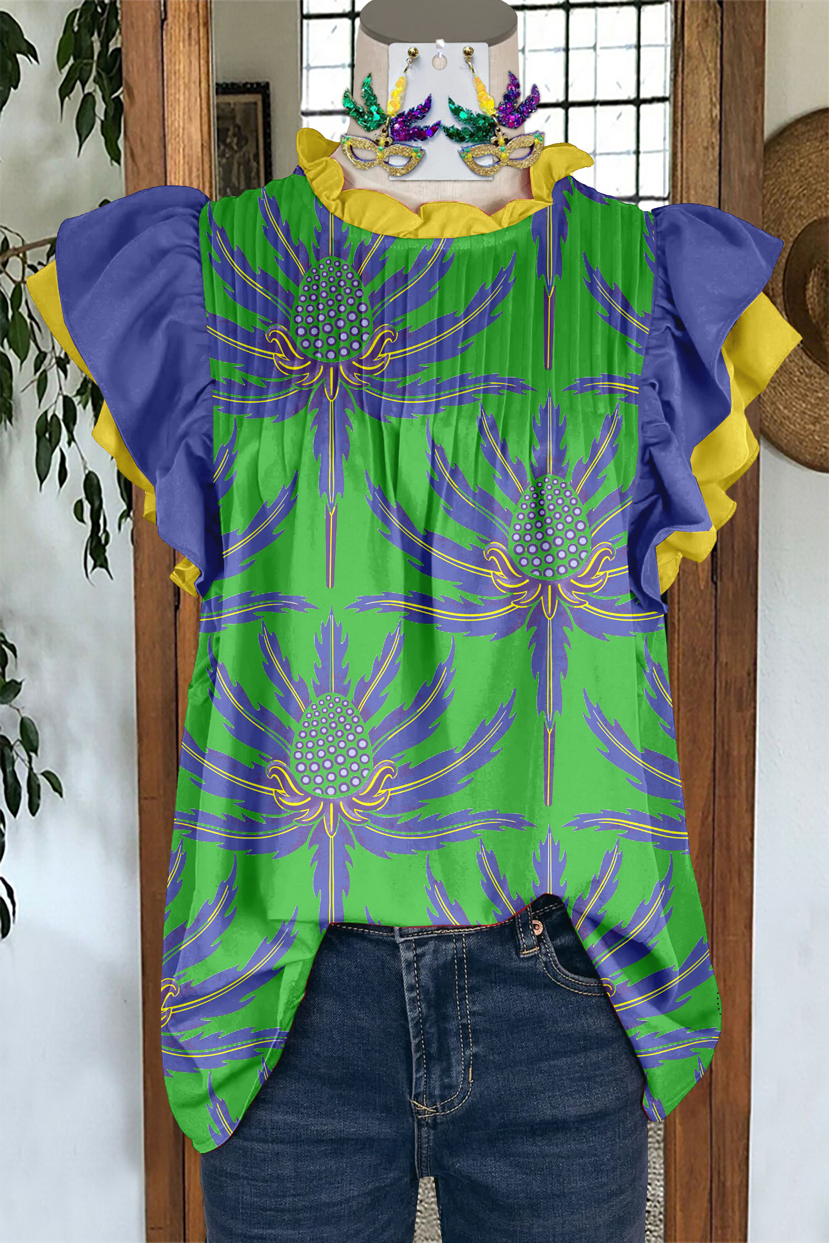 Unique Mardi Gras Botanical Print Pleated Fly Sleeve Blouse