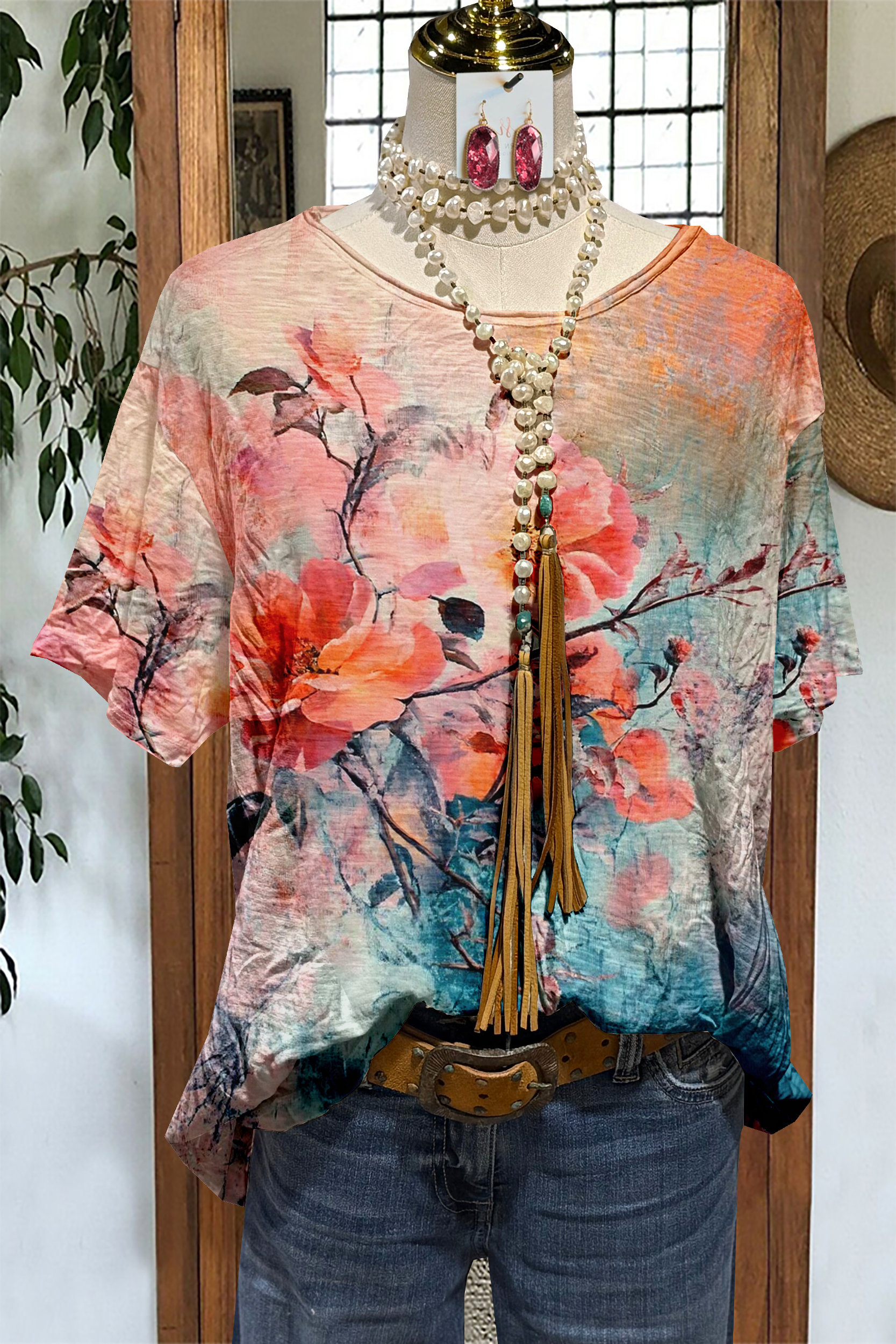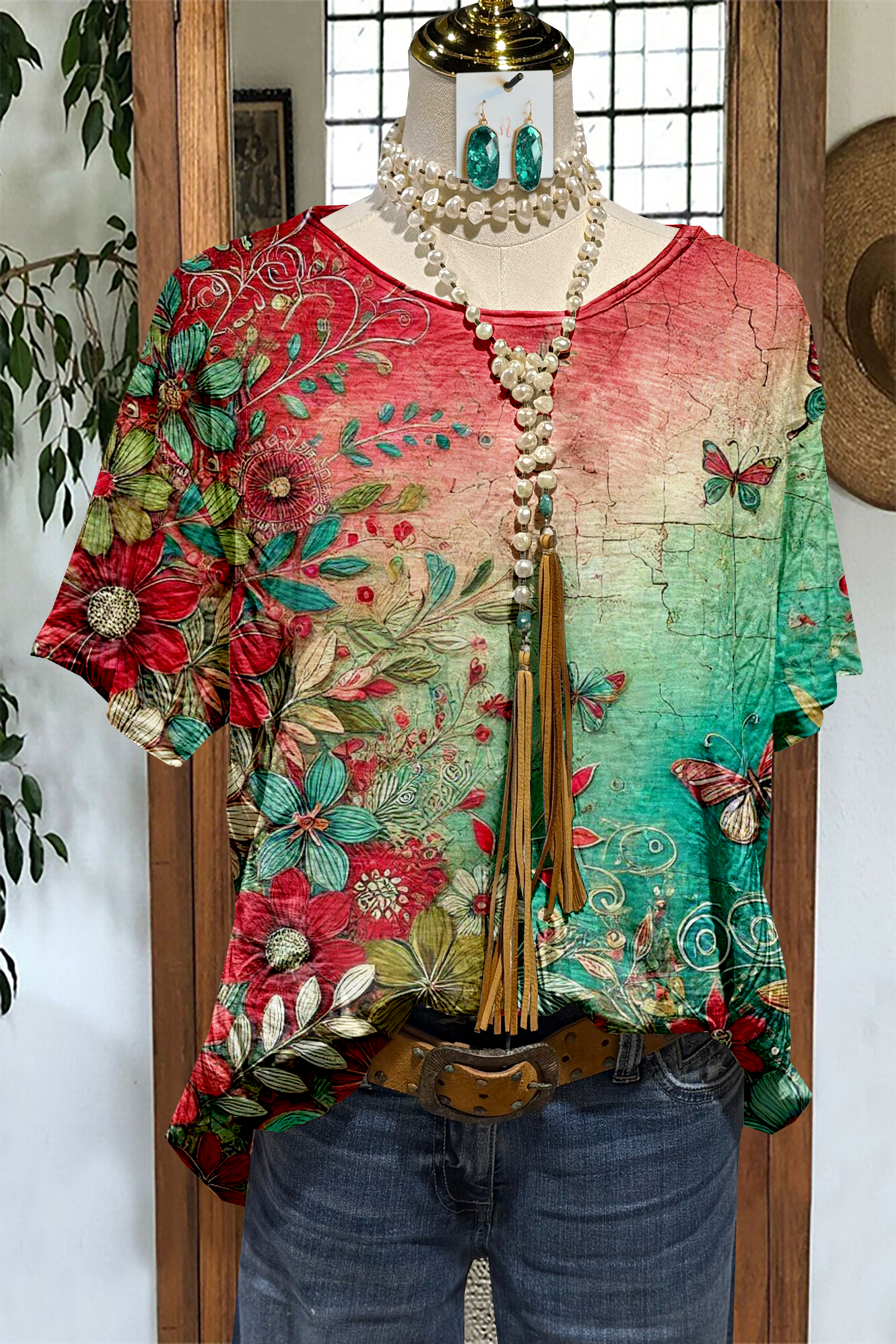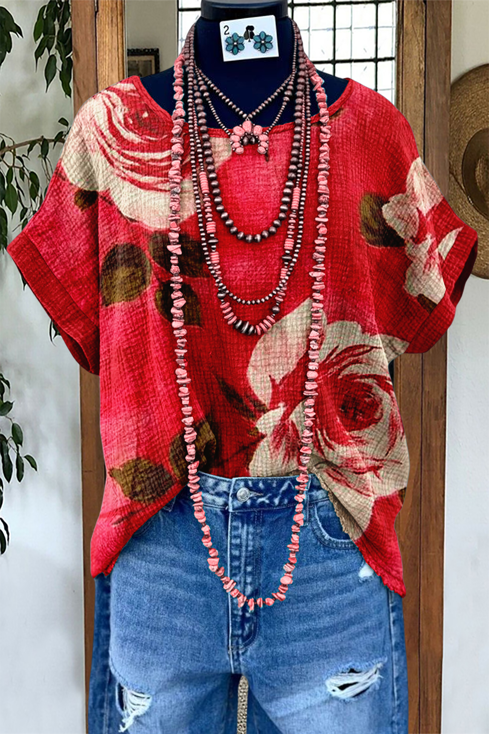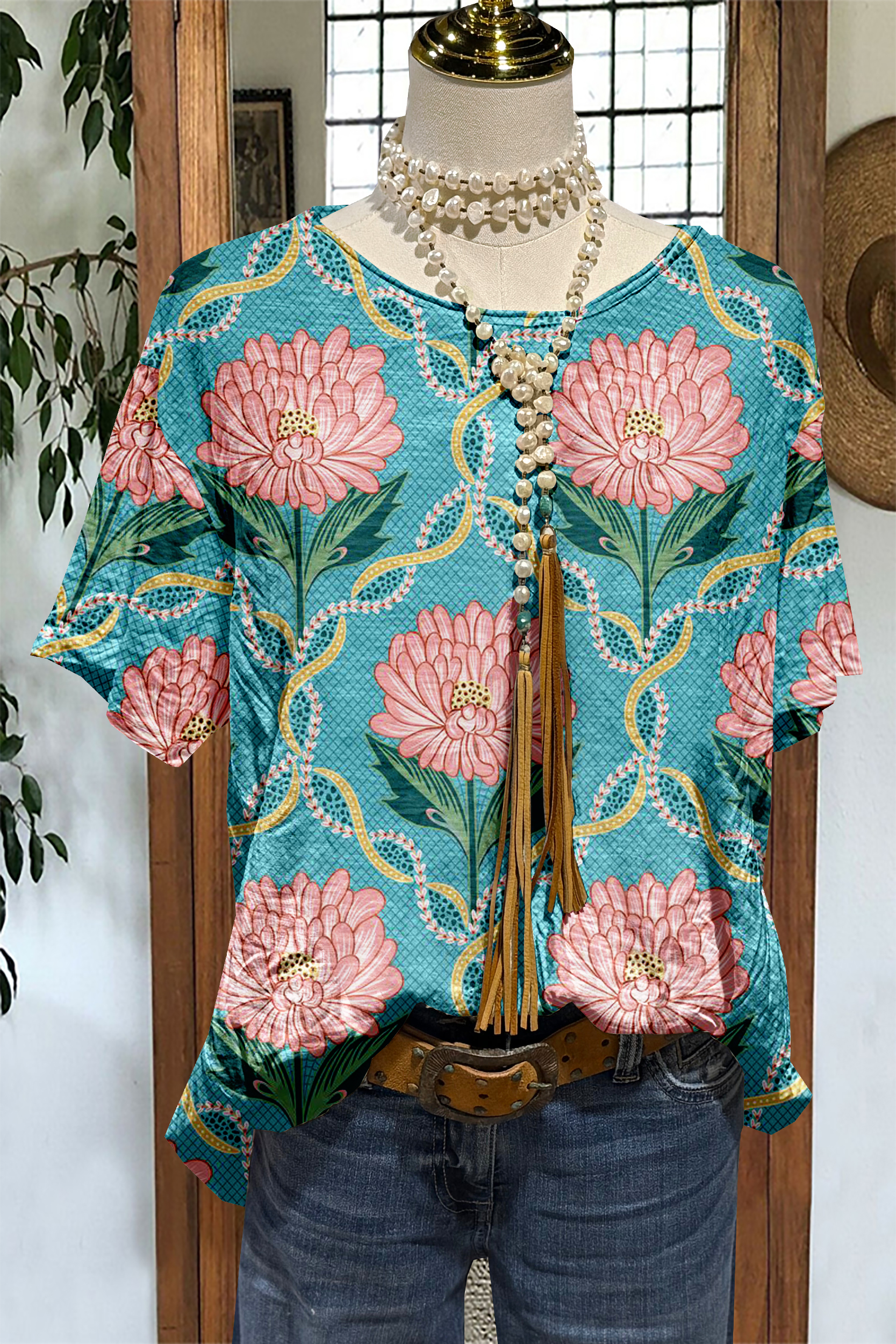 Classic Floral Print Textured Bat Sleeve T-Shirt