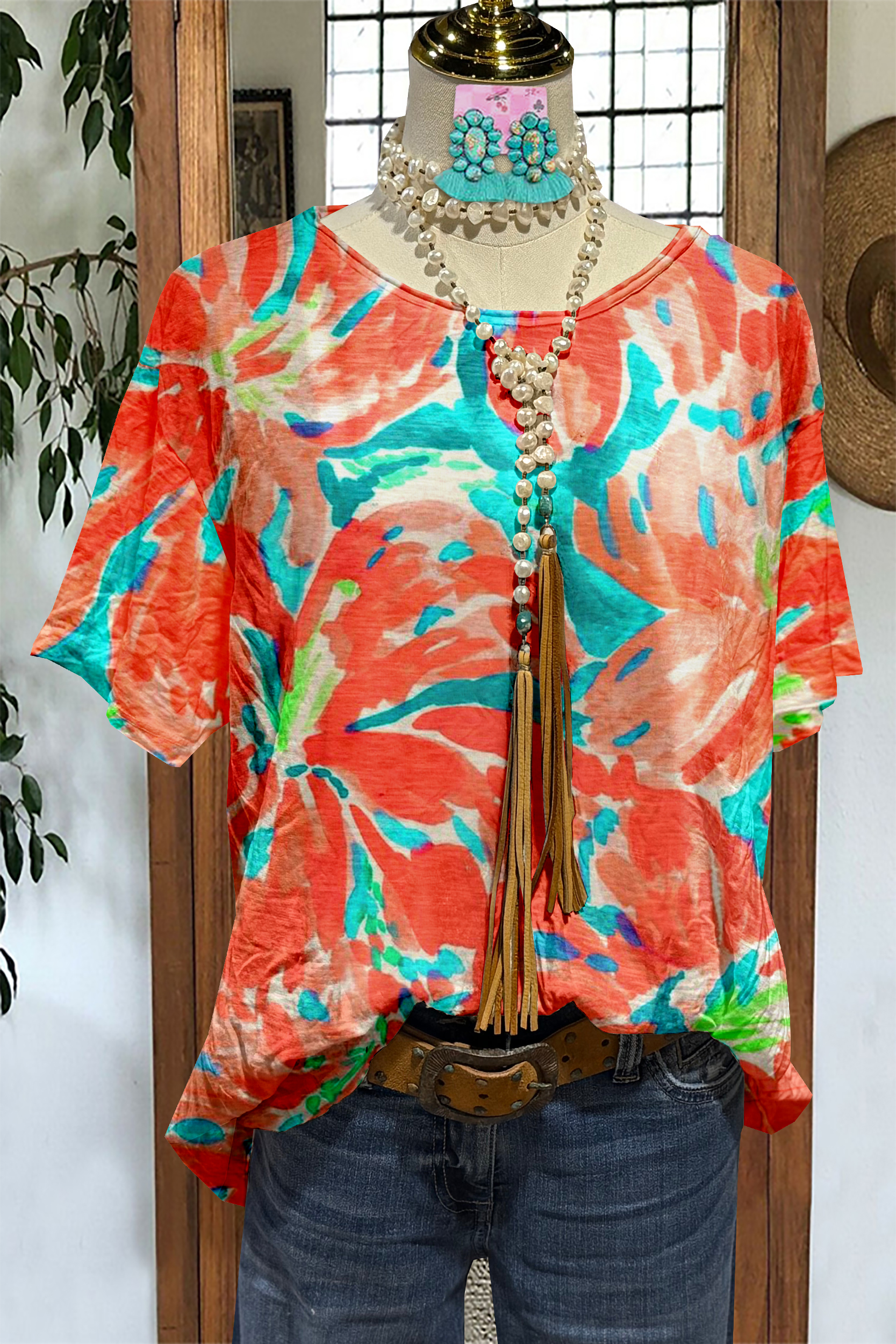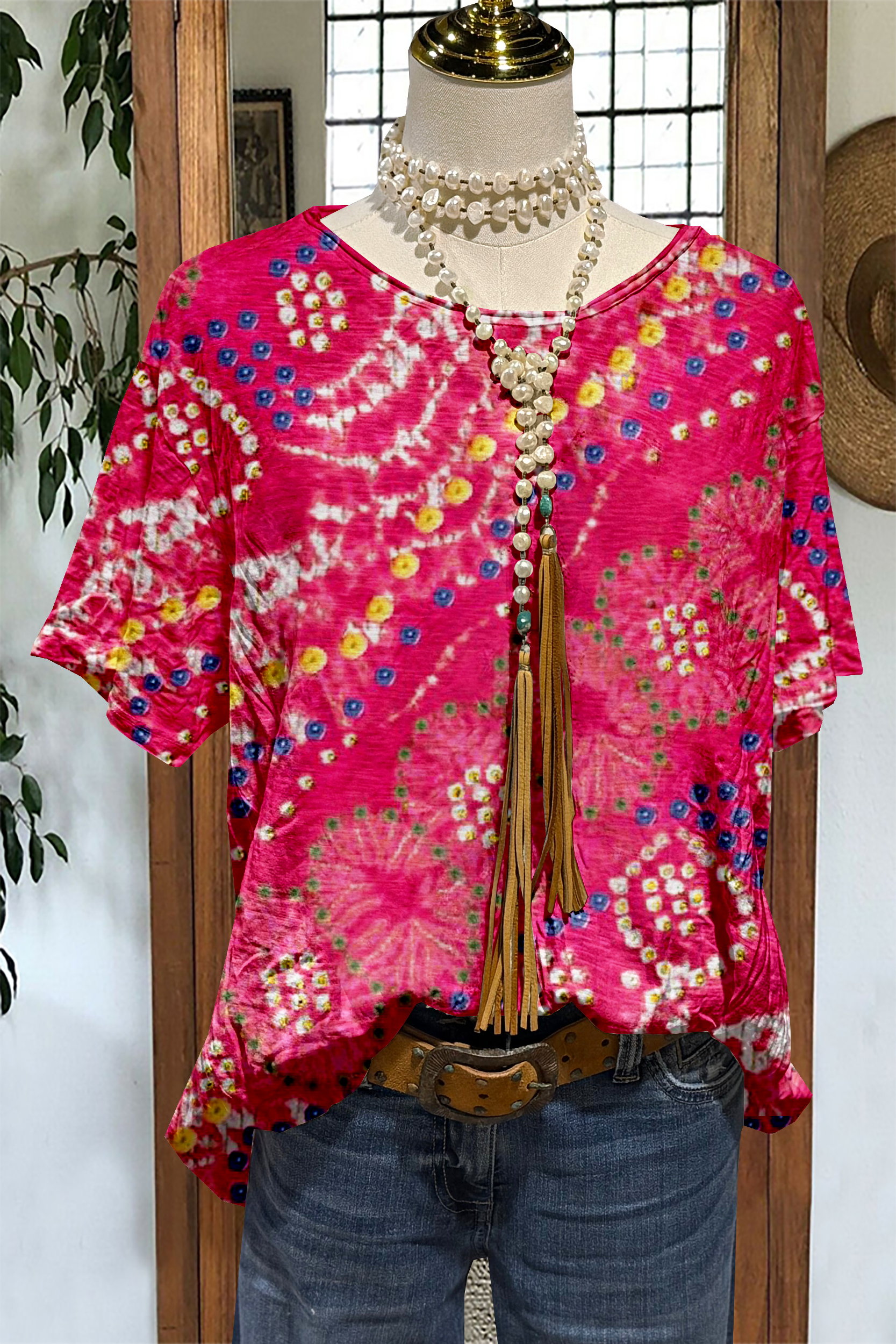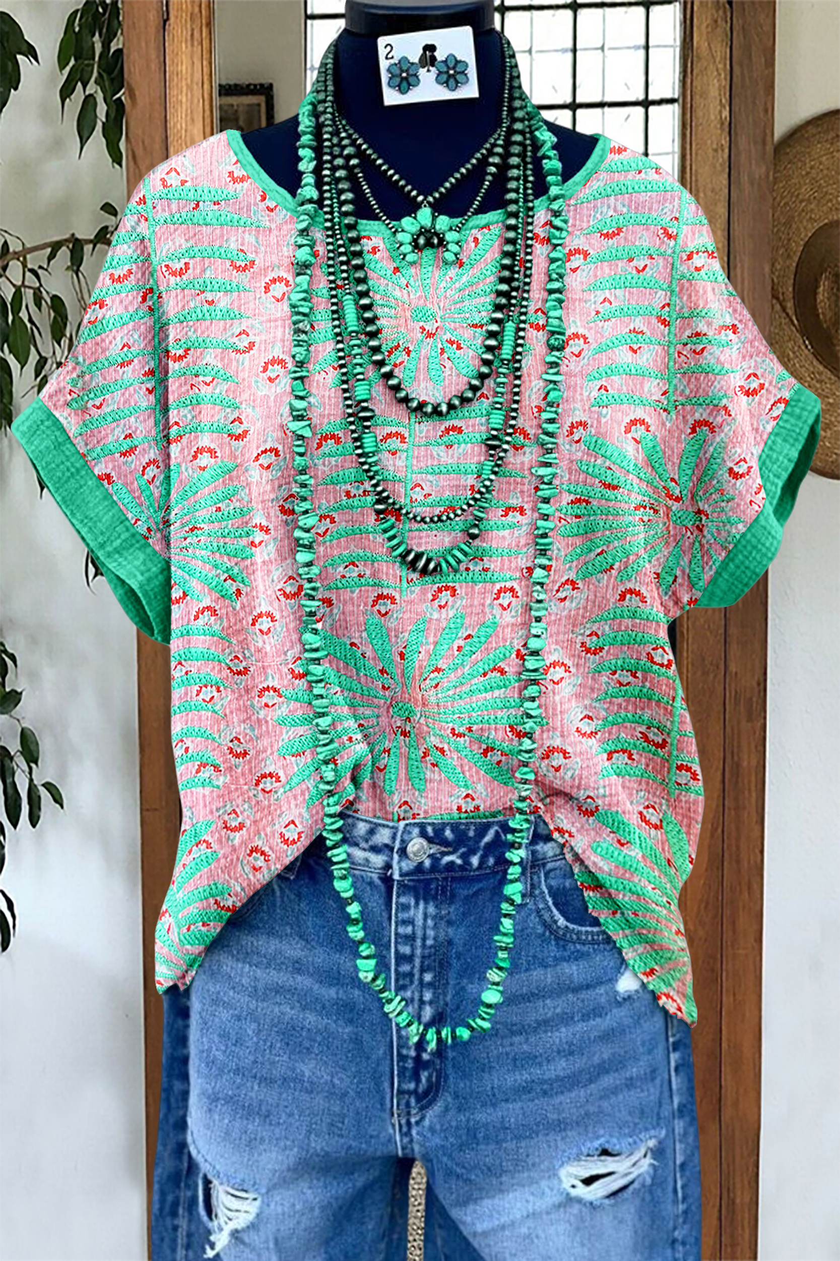 Classic Floral Print Textured Bat Sleeve T-Shirt
