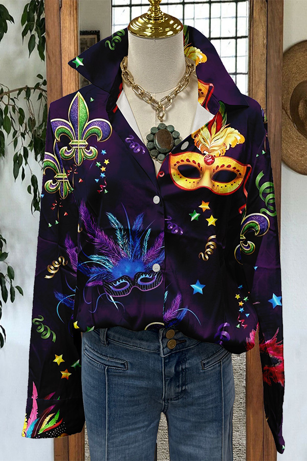 Mardi Gras Abstract Print Puff Sleeve Blouses