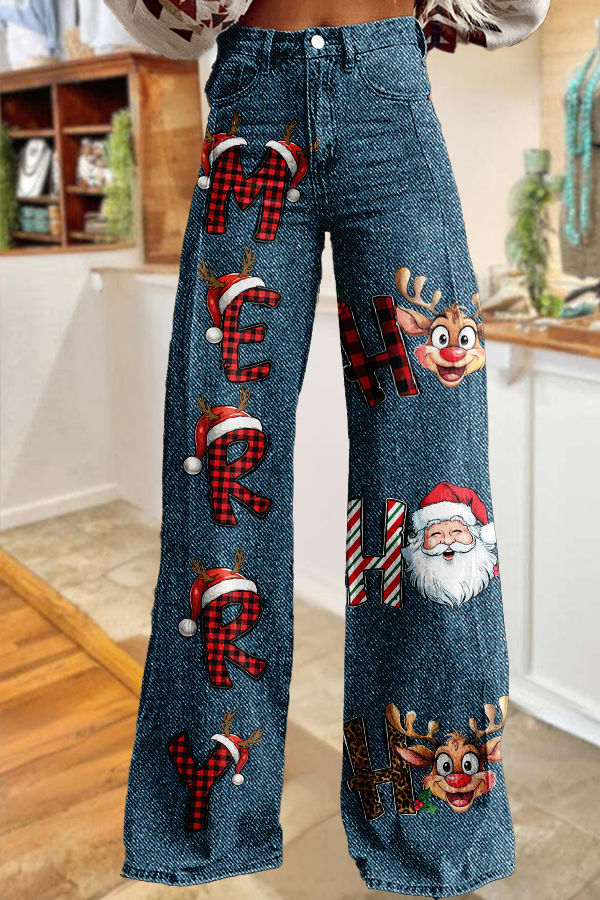 Denim-Style Christmas Heart Print Wide-Leg Pants