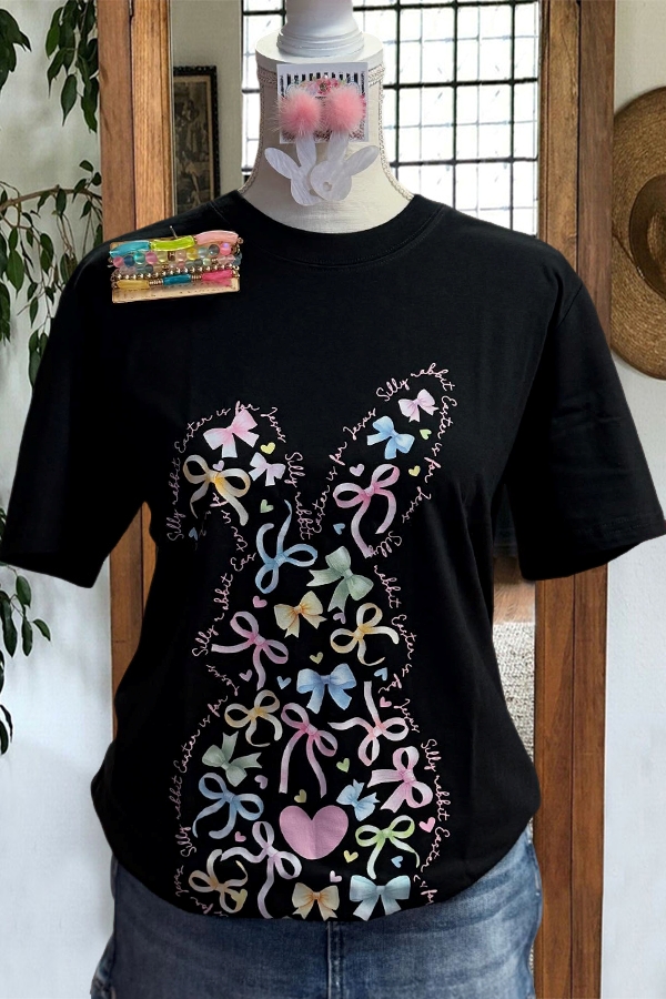 Cute Easter Bunny Bow Print Puff Sleeve Blouse