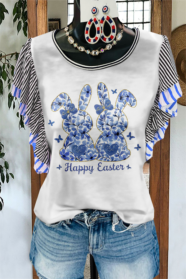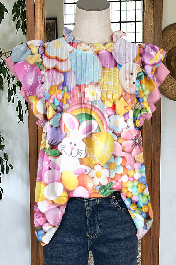 Cute Easter Bunny Eggs Print Ruffled Sleeve Paneled Pleated Blouse