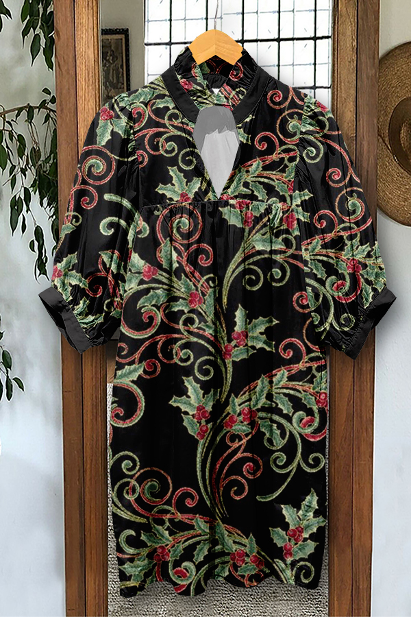 Elegant Christmas Floral Print Puff Sleeve Dress