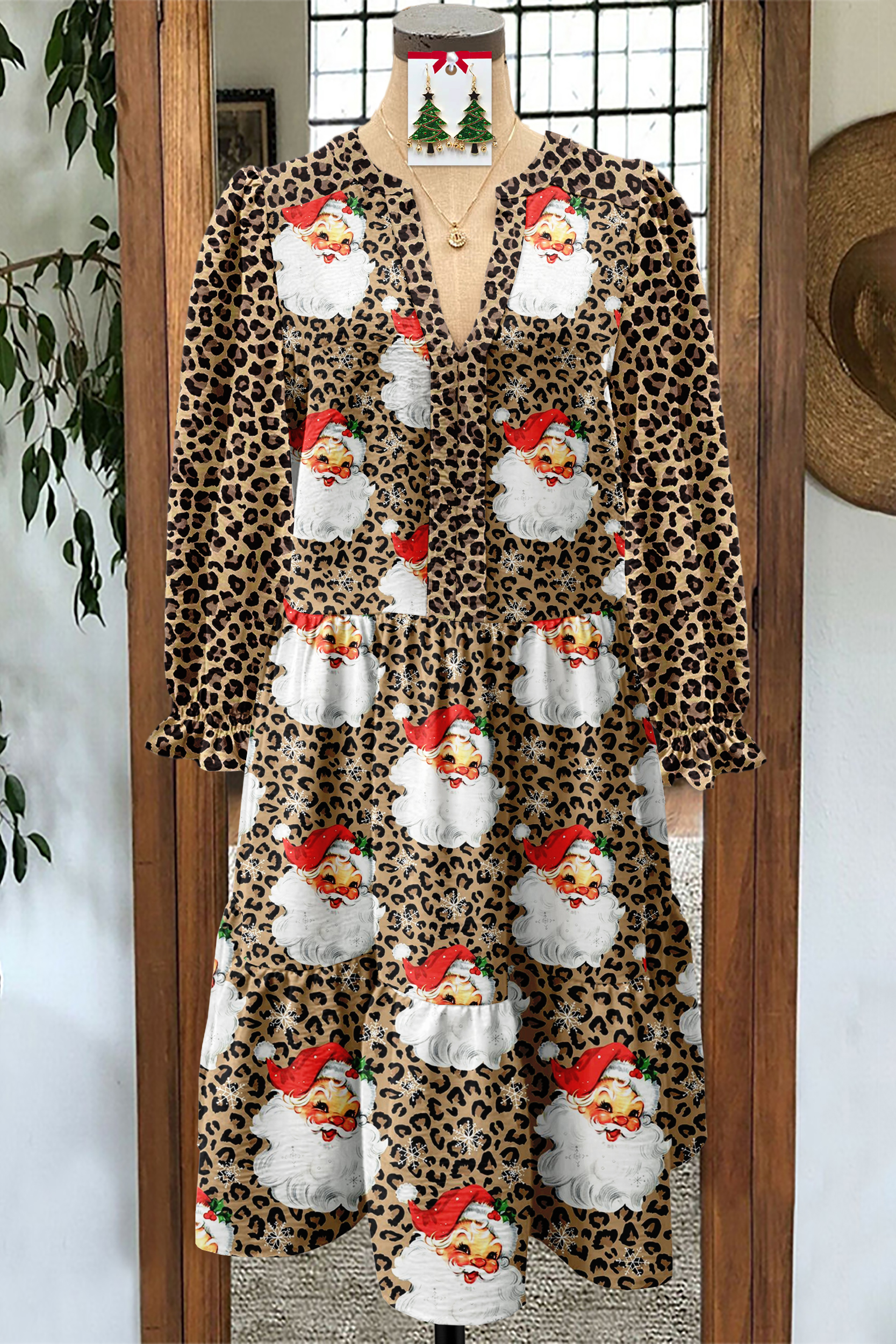 Classic Christmas Santa Claus Print Textured Dress