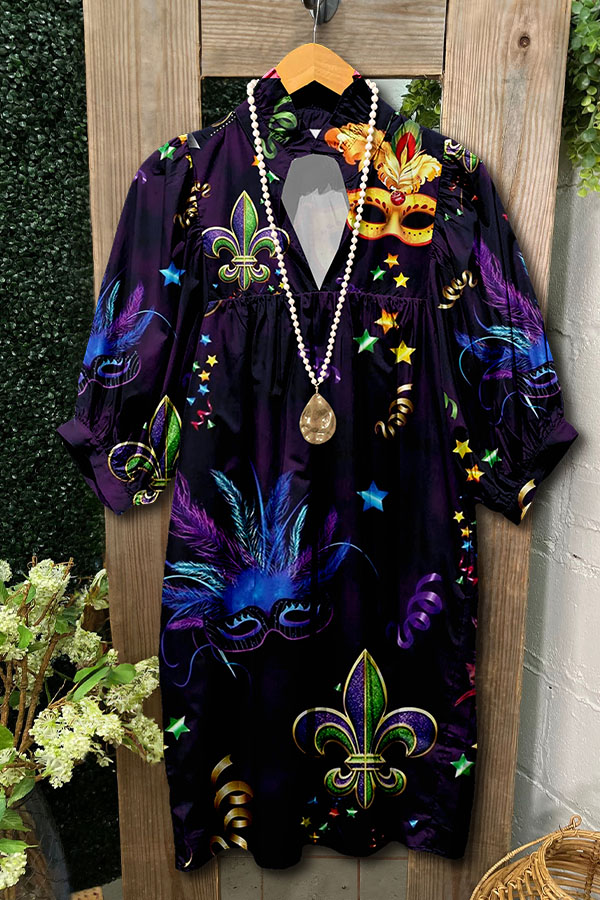 Mardi Gras Mask V-Neck Ruffled Puff Sleeve Dress