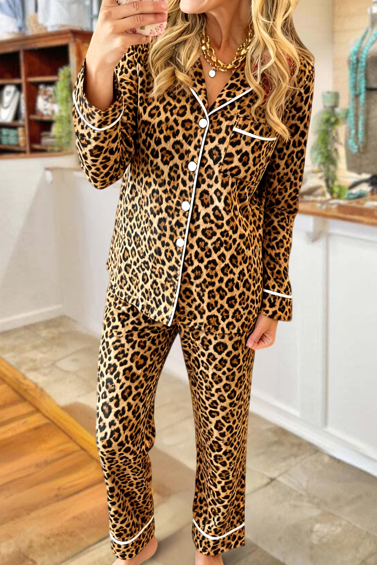 Classic Leopard Print Top and Pants Pajama Set
