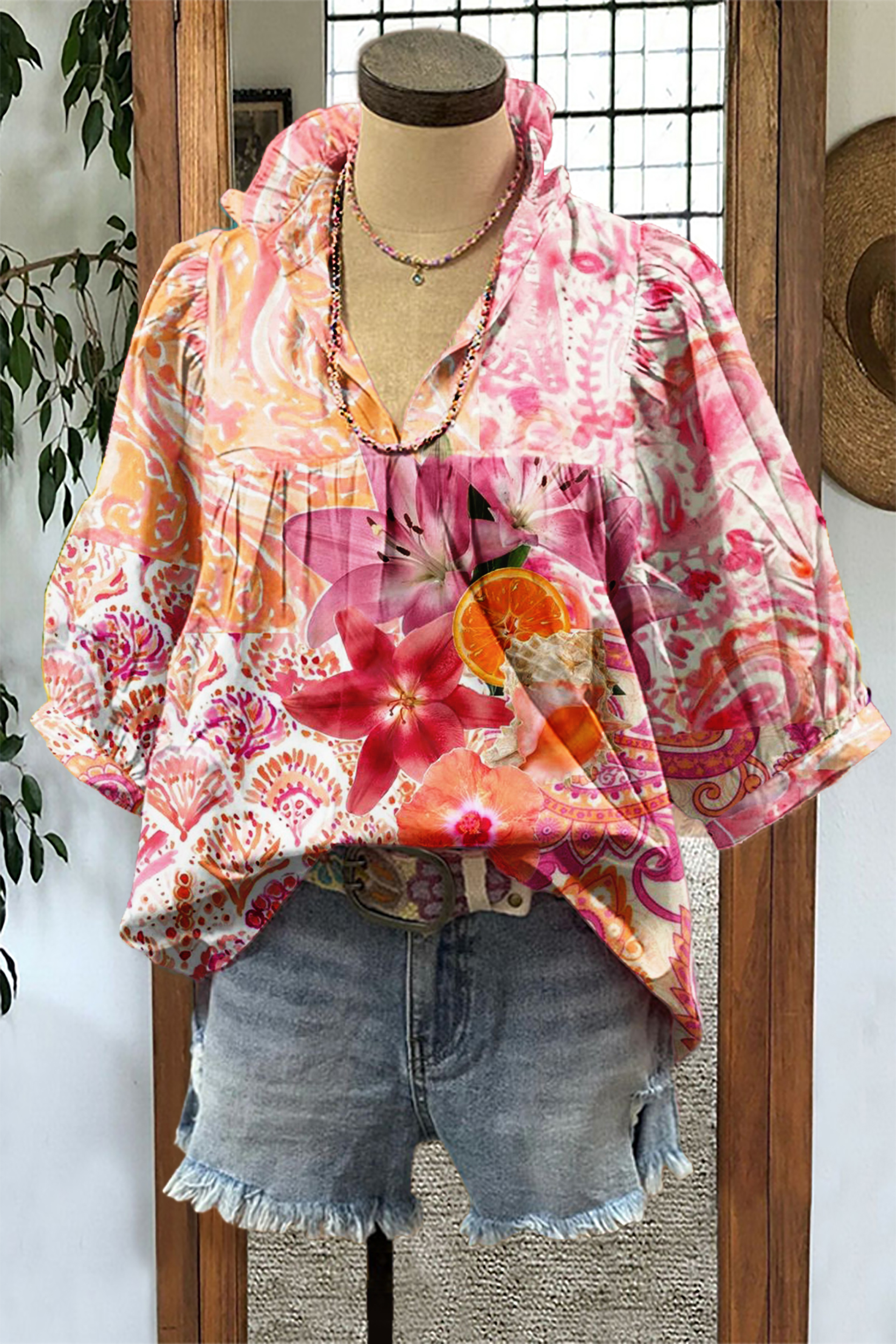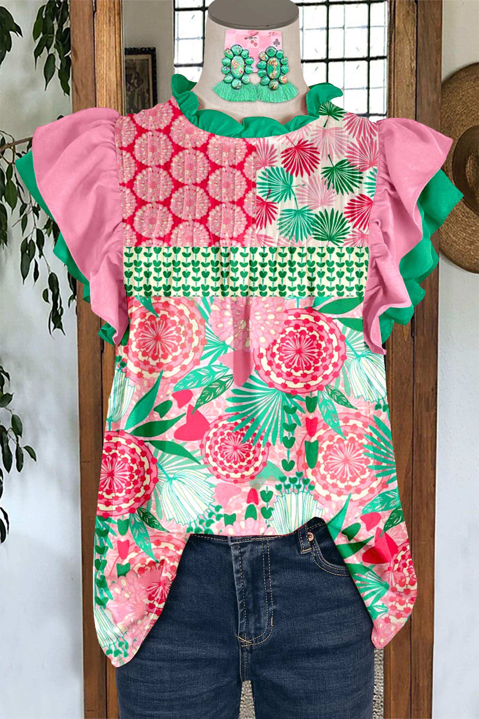 Fresh Floral Print Pleated Fly Sleeve Blouse