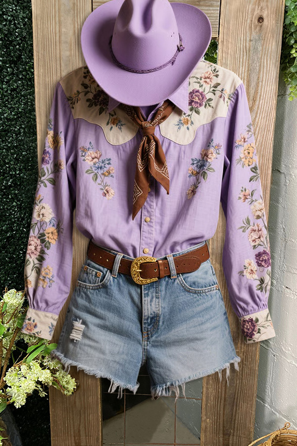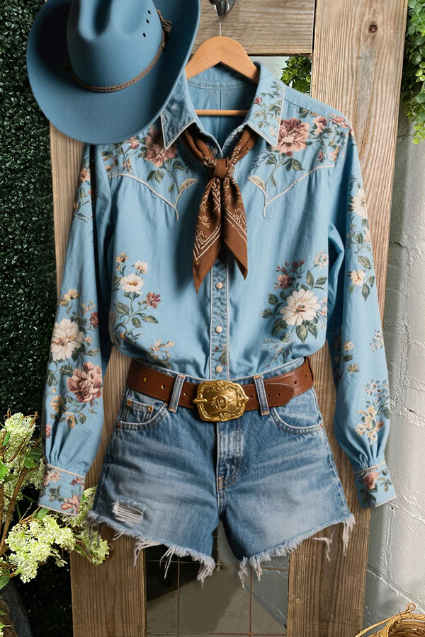 Romantic Vintage Denim Floral Patchwork Shirt