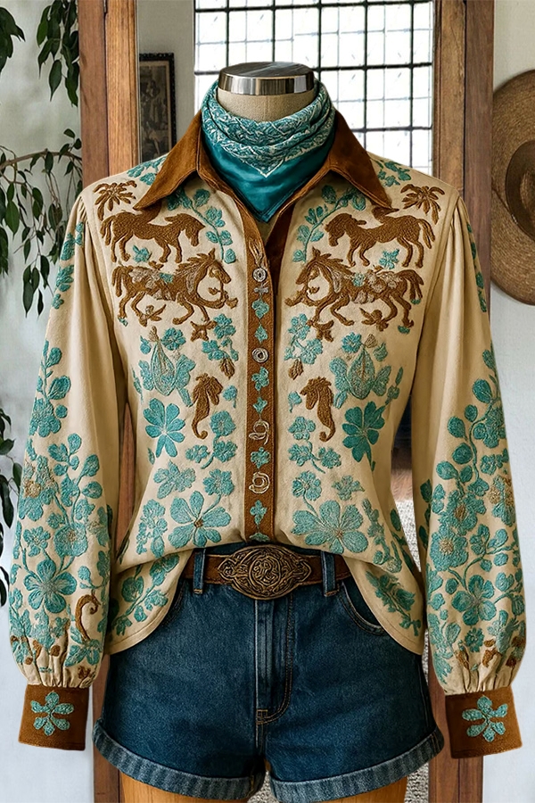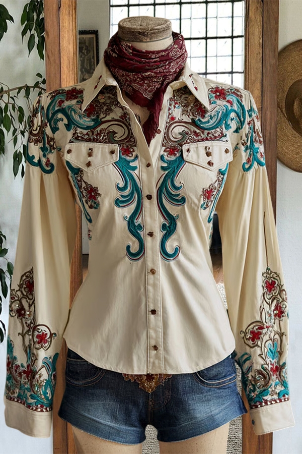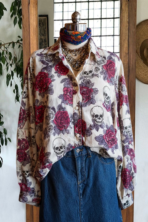 Vintage Floral Print Collared Long Sleeve Shirt