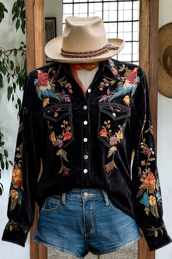 Vintage Western Bird And Flower Double Pocket Shirt