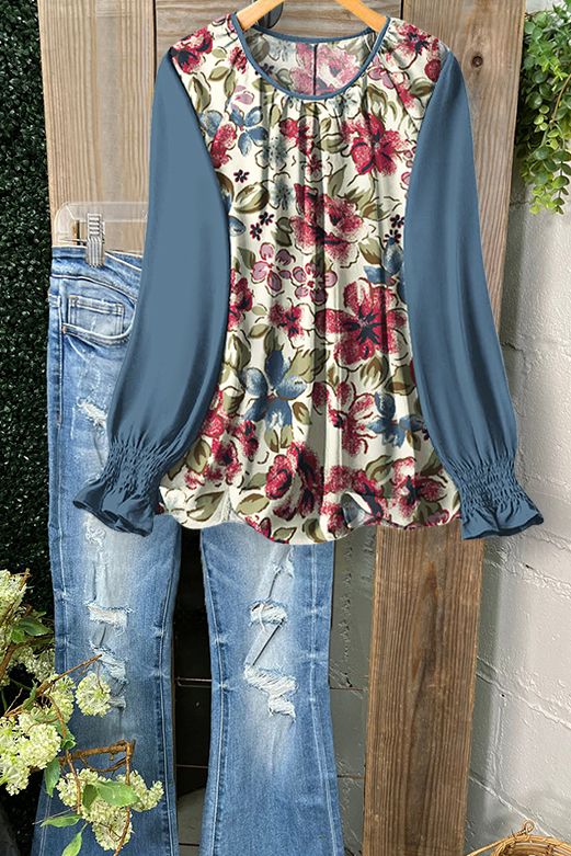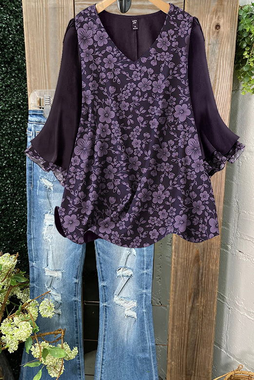 Romantic Floral Ruched Patchwork Ruffle Sleeve Top