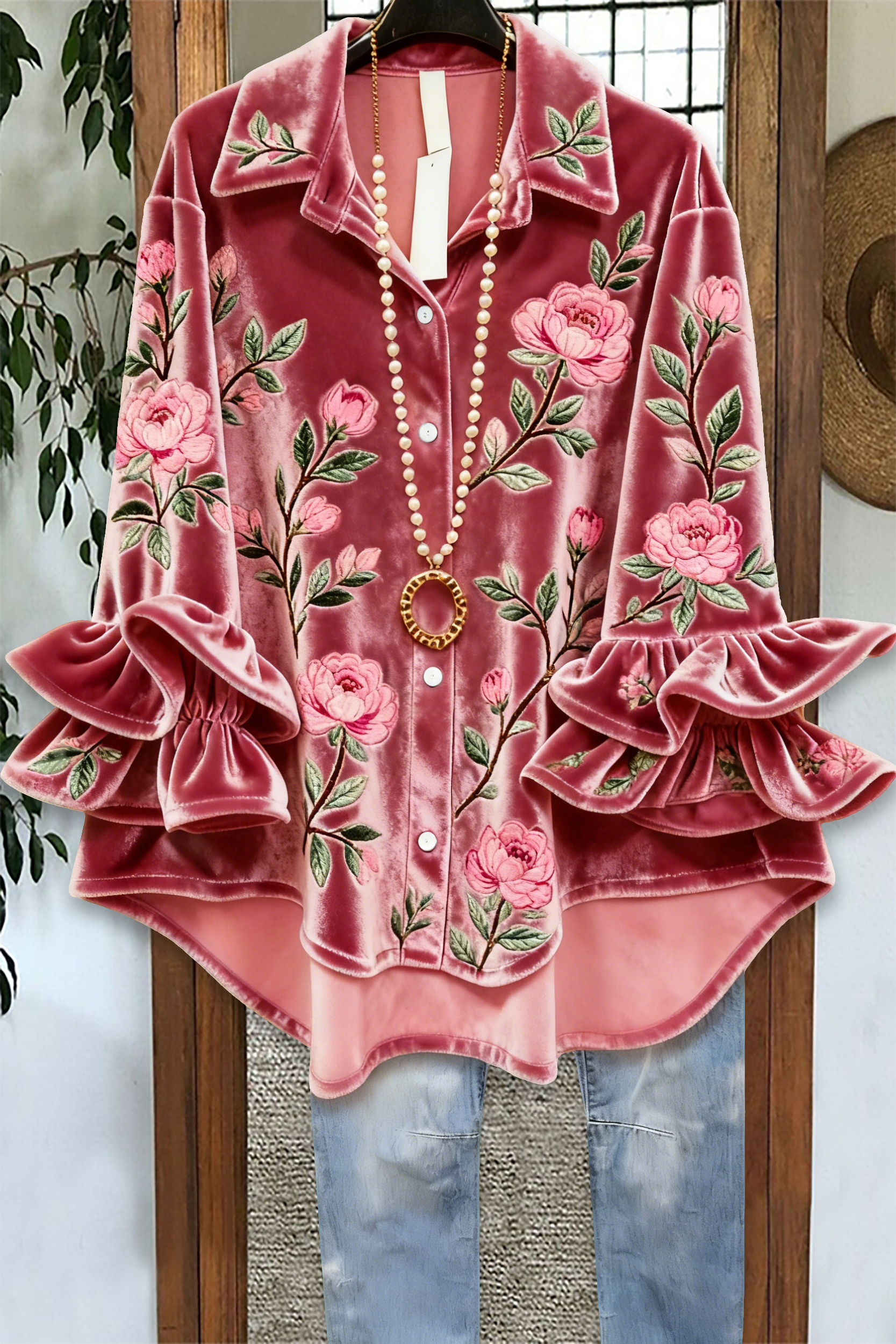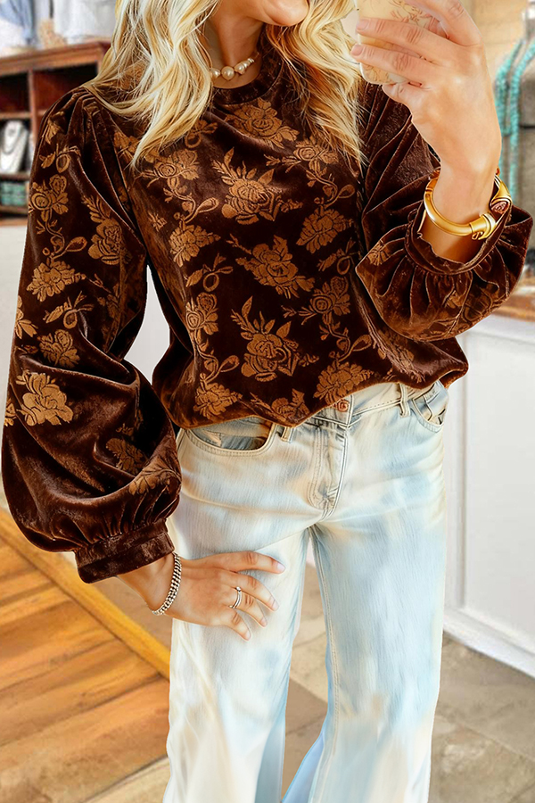 Velvet Leopard Print Floral Print Ruffled Top