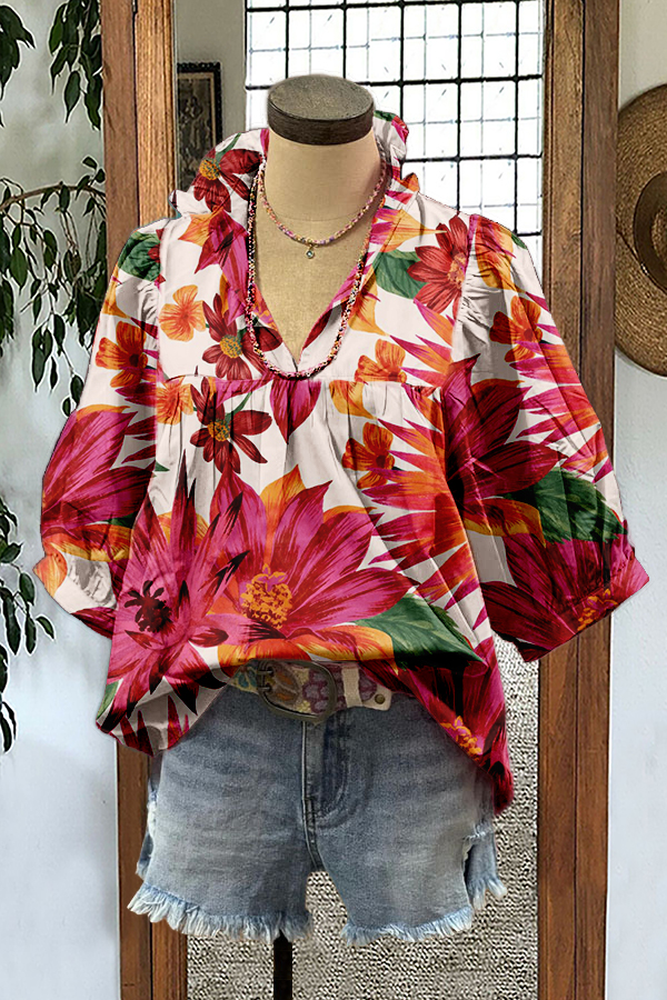 Floral Valentine's Day Print Puff Sleeve Blouse