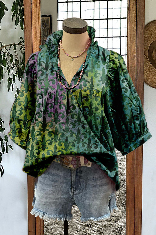 Stay on trend this season in our new chic, v neck top. We especially love the graphic print fabric and think this piece will be a new favorite in your closet!