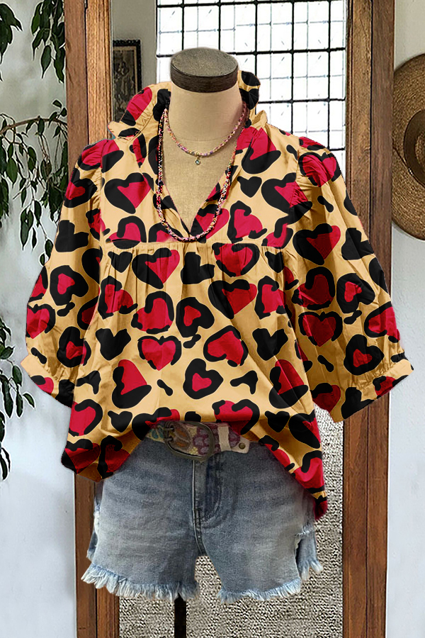 Cute Valentine's Day Leopard Print Puff Sleeve Blouse