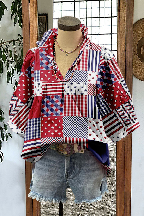 Unique Splicing Patriotic Day Print Puff Sleeve Blouse
