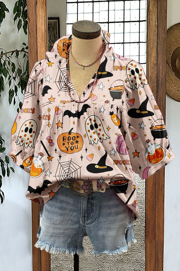 Cute Halloween Pumpkins Witch Hat Print Puff Sleeve Top