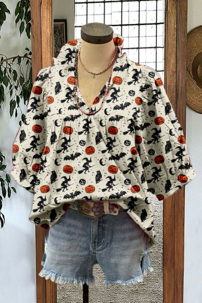 Elegant Halloween Paneled Pumpkin Print Puff Sleeve Top