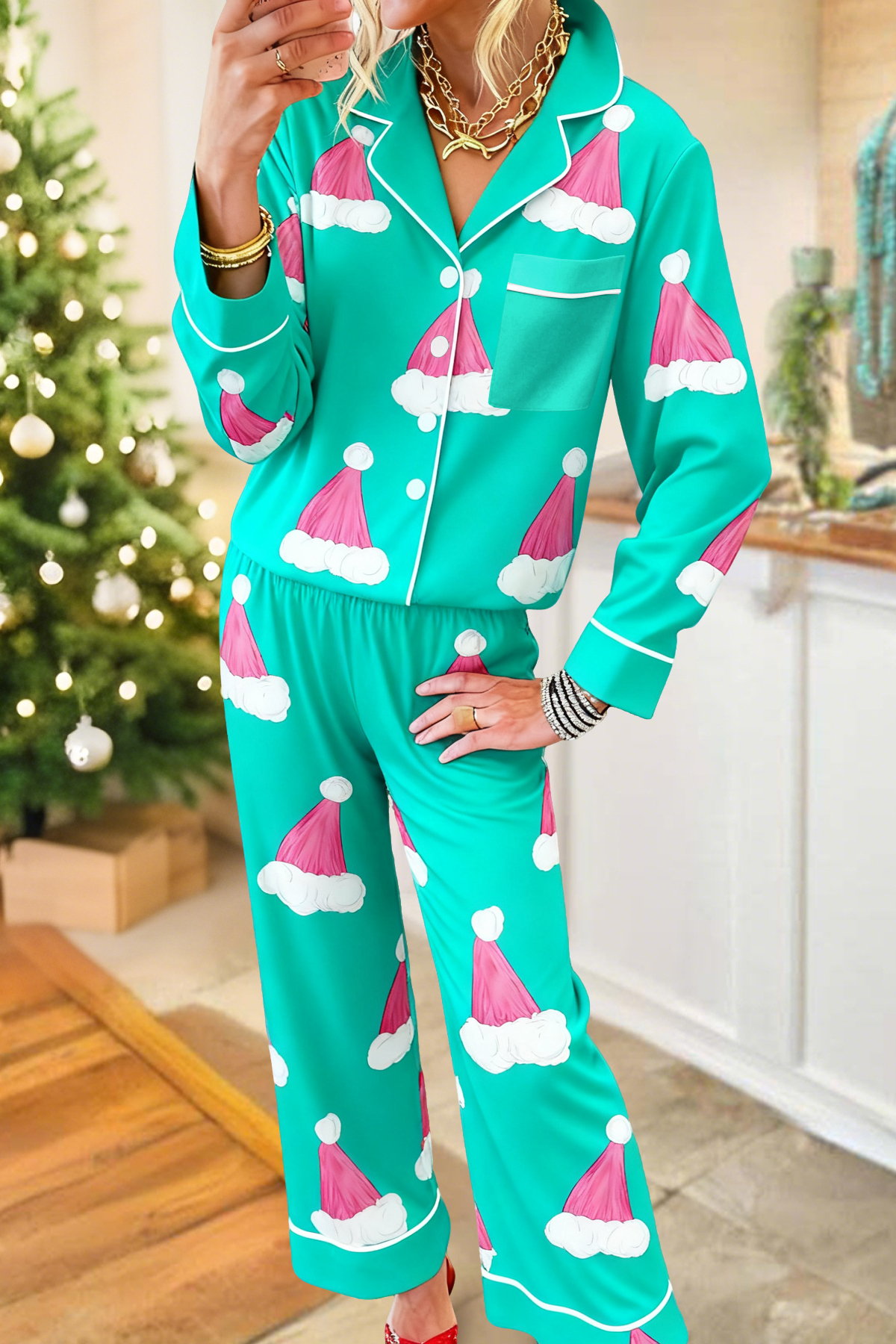 Cute Santa Hat Top and Pants Pajama Set
