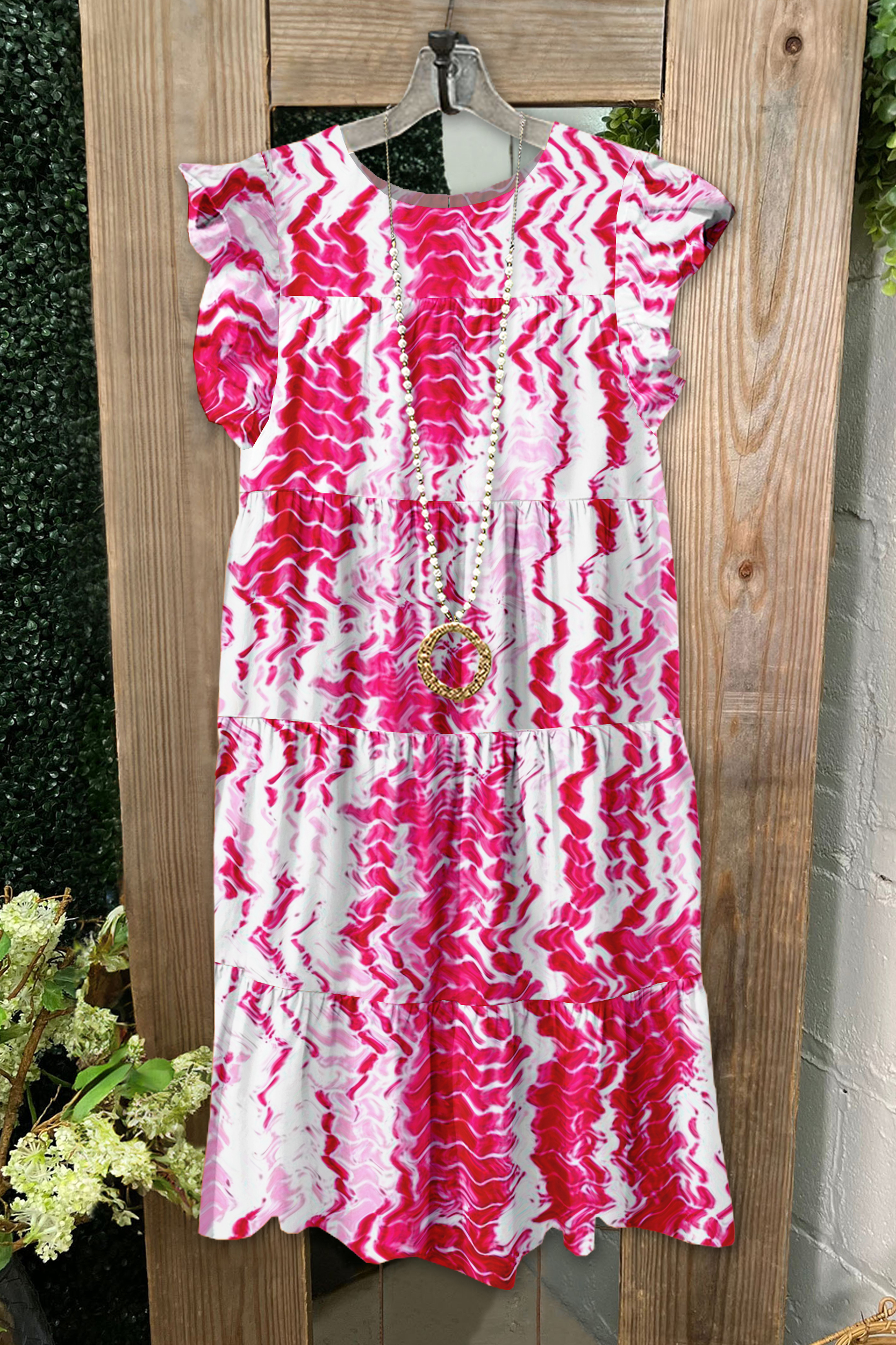 Fresh Wave Print Pleated Fly Sleeves Dress