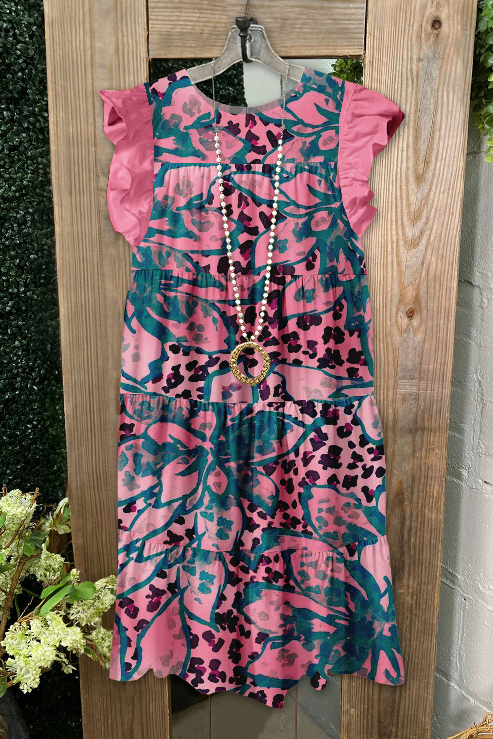 Classic Leopard Floral Print Fly Sleeve Dress