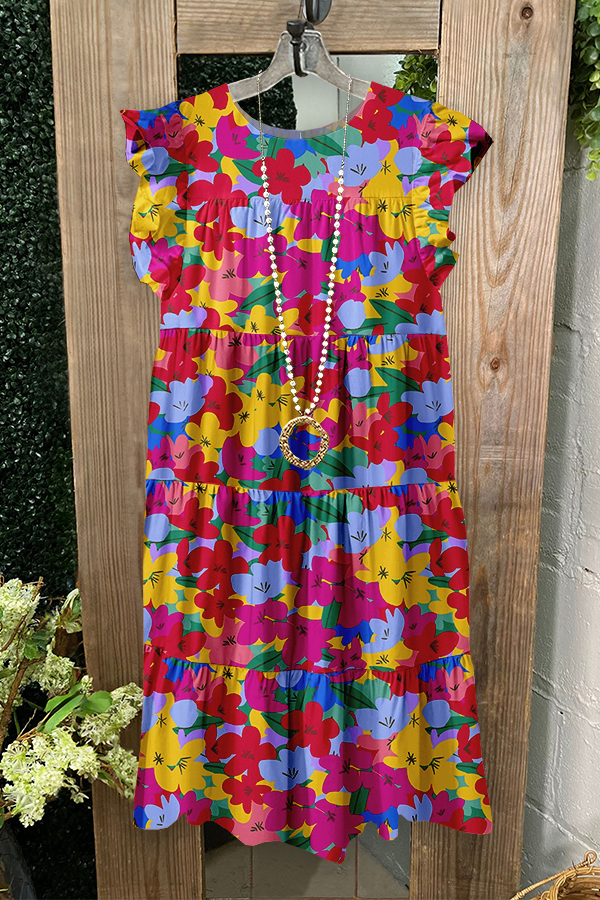 Cute Colorful Floral Print Ruffled Pleated Dress