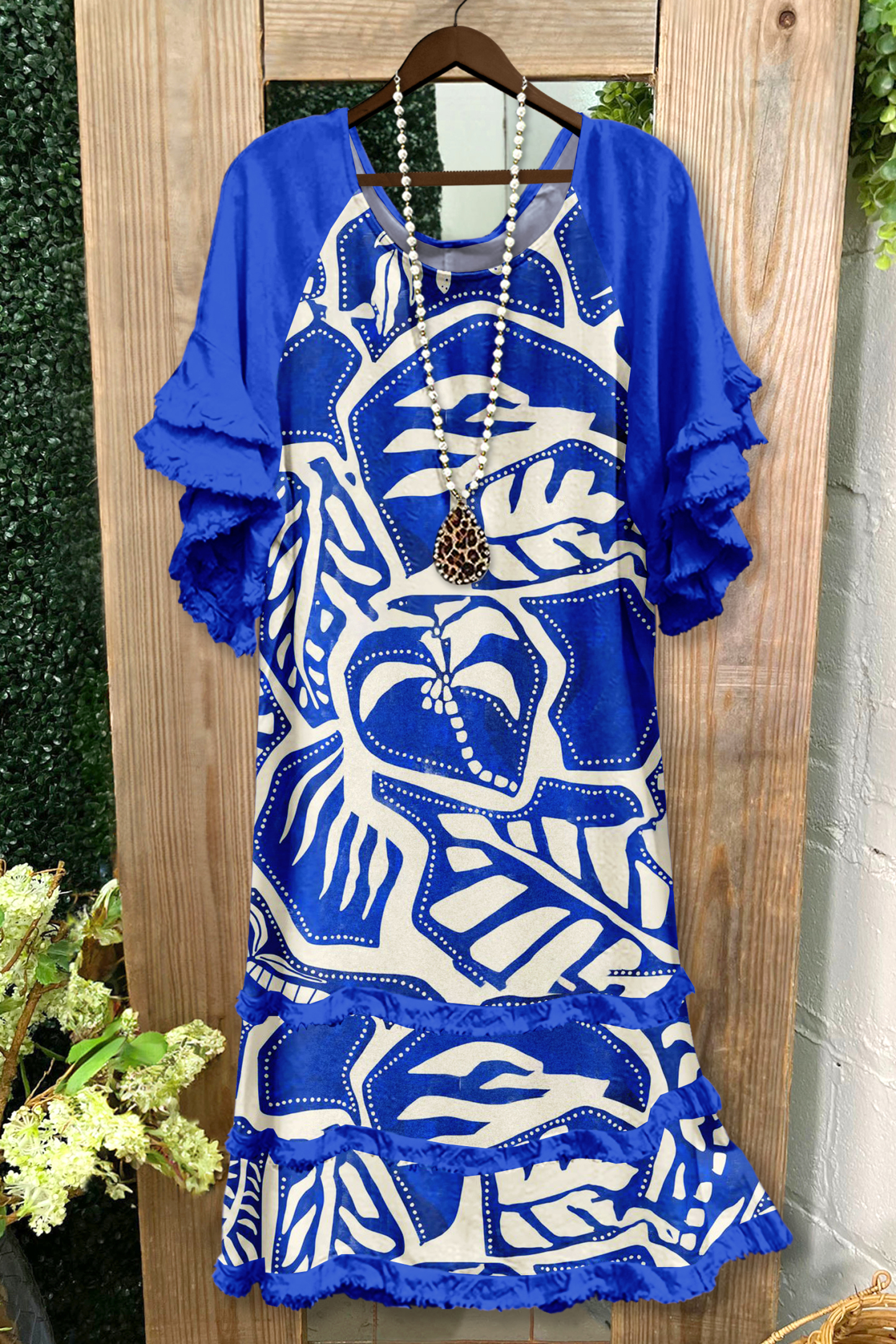 Classic Leaf Print Ruffled Raglan Sleeve Dress