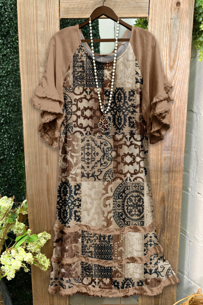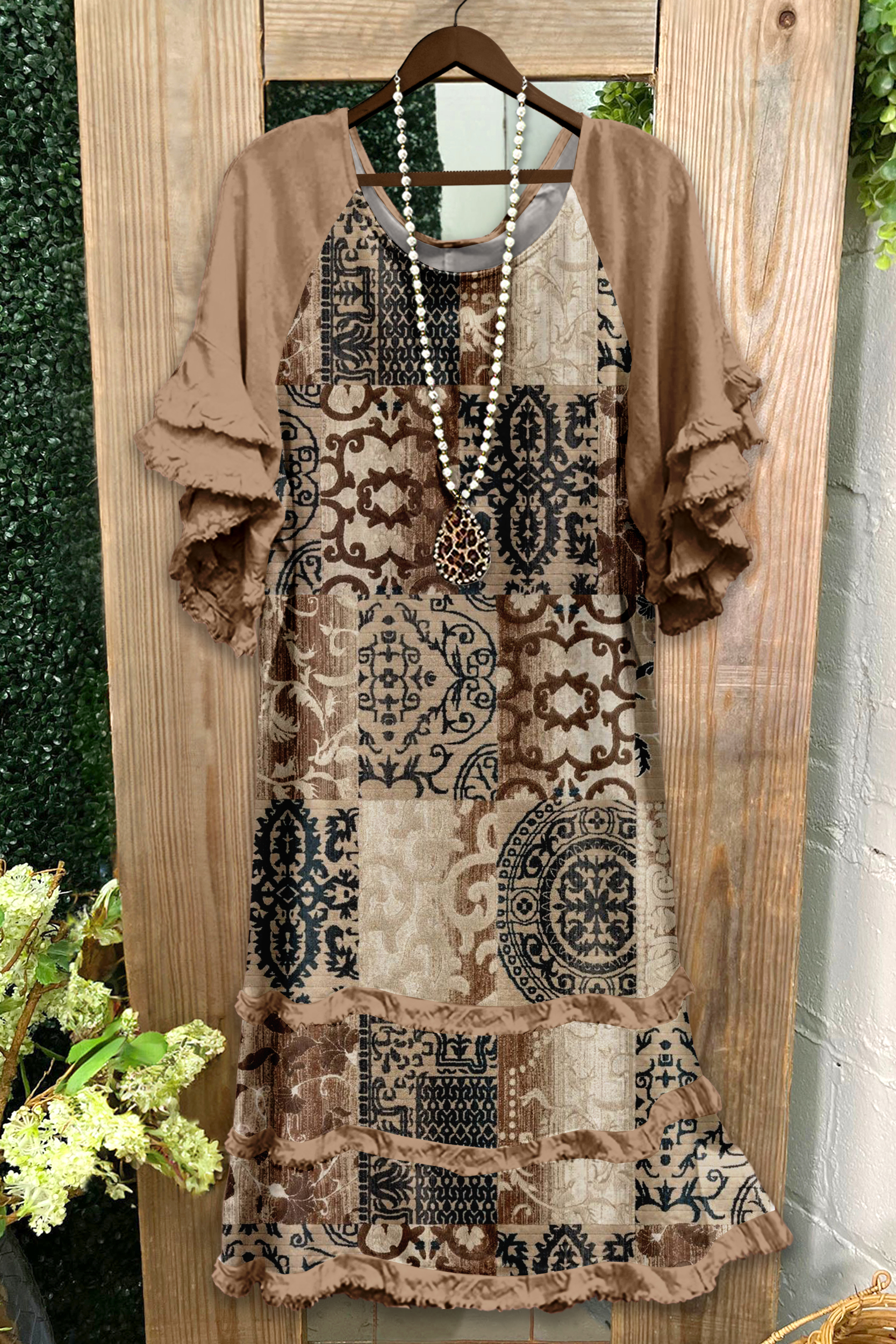 Retro Patchwork Print Ruffled Raglan Sleeve Dress