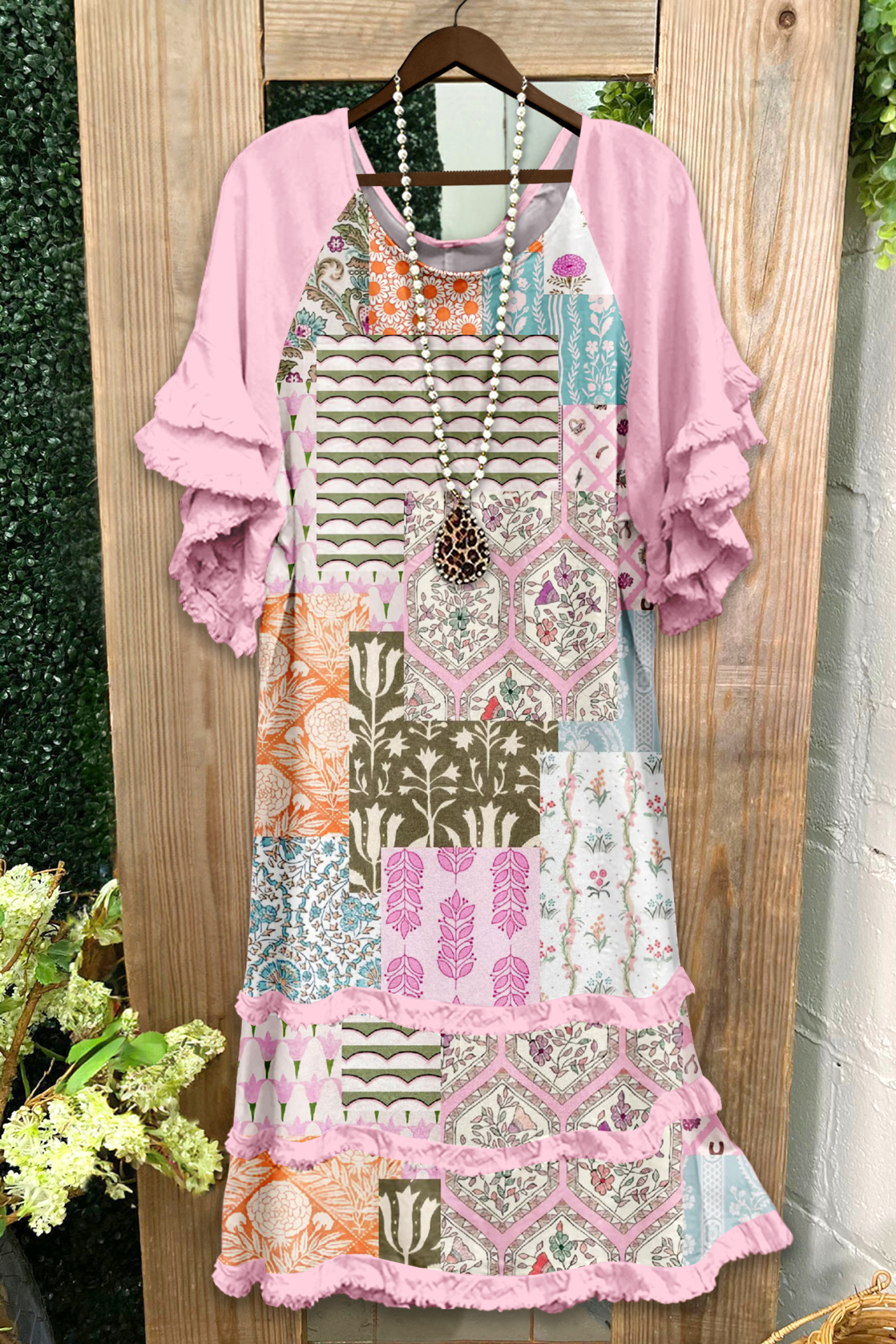 Paneled Print Ruffled Raglan Sleeve Dress