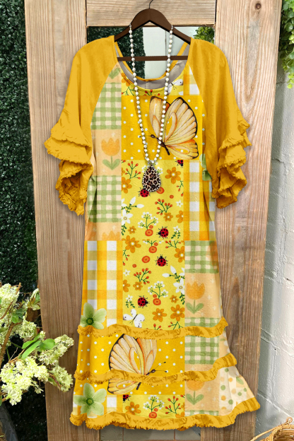 Butterfly Paneled Print Ruffled Raglan Sleeve Dress