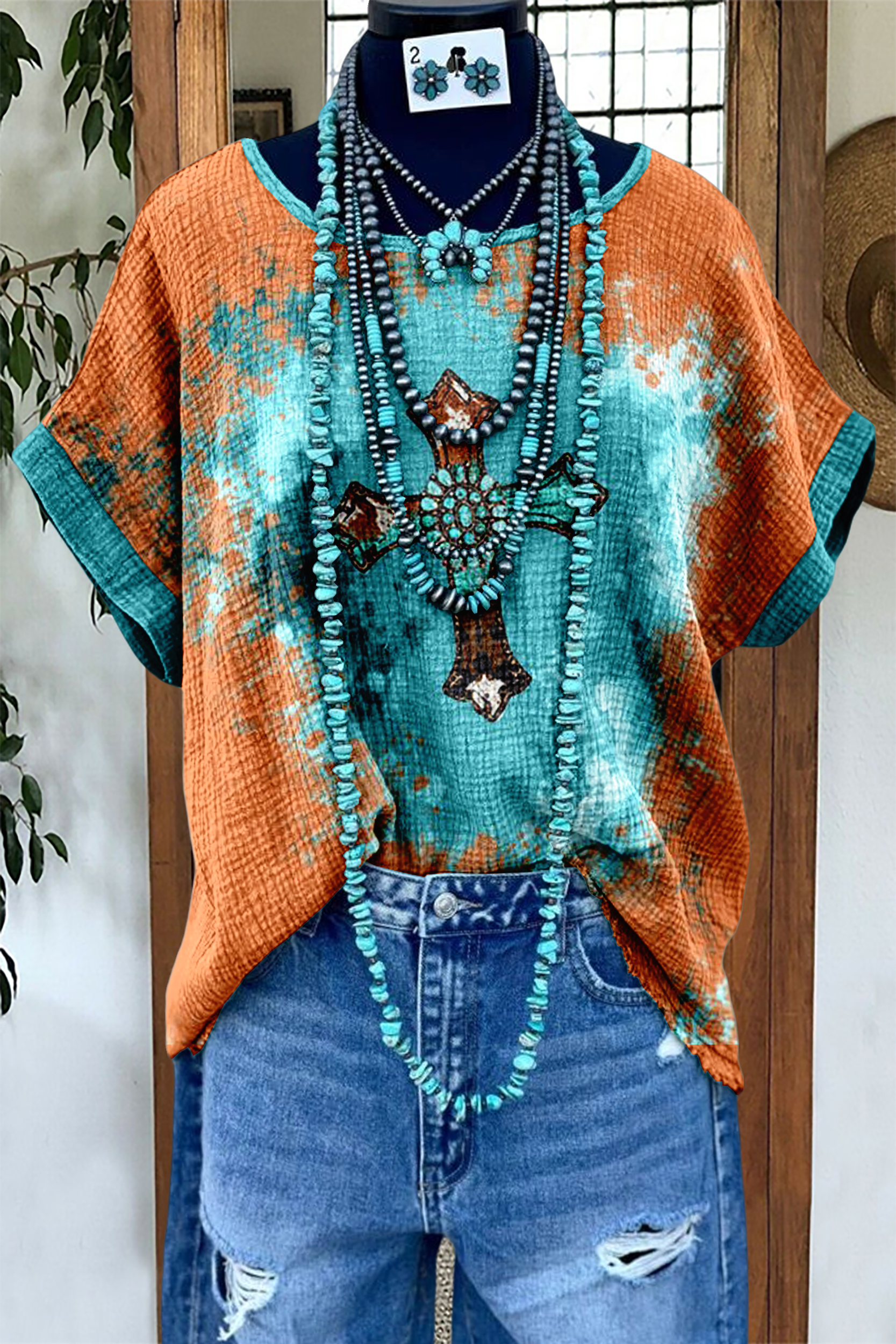 Vintage Cross Print Distressed Bat Sleeve T-Shirt