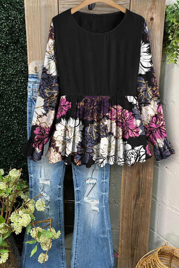 Elegant Colorful Floral Patchwork Ruffle Sleeve Top
