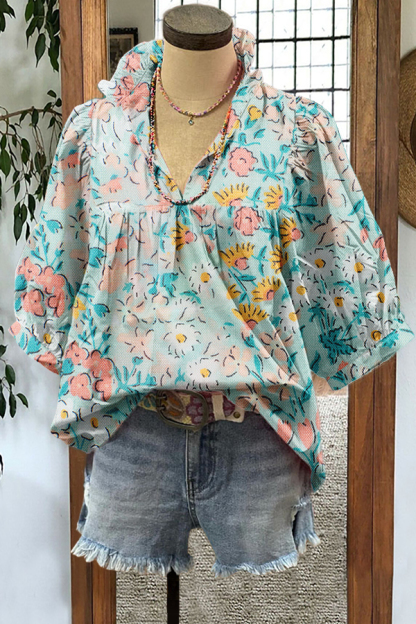 Fresh Floral Print Pleated Puff Sleeves Blouse