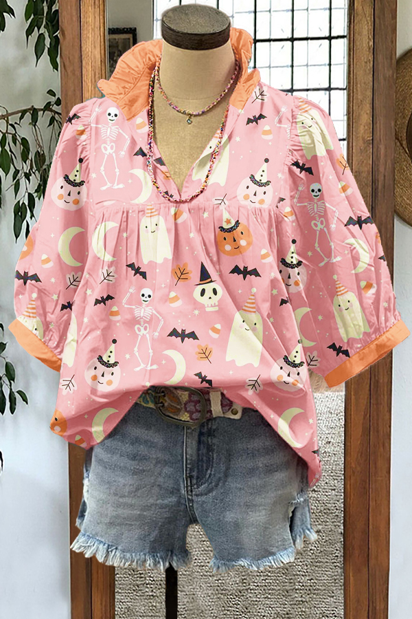 Cute Halloween Skull Ghost Pumpkin Puff Sleeve Blouse