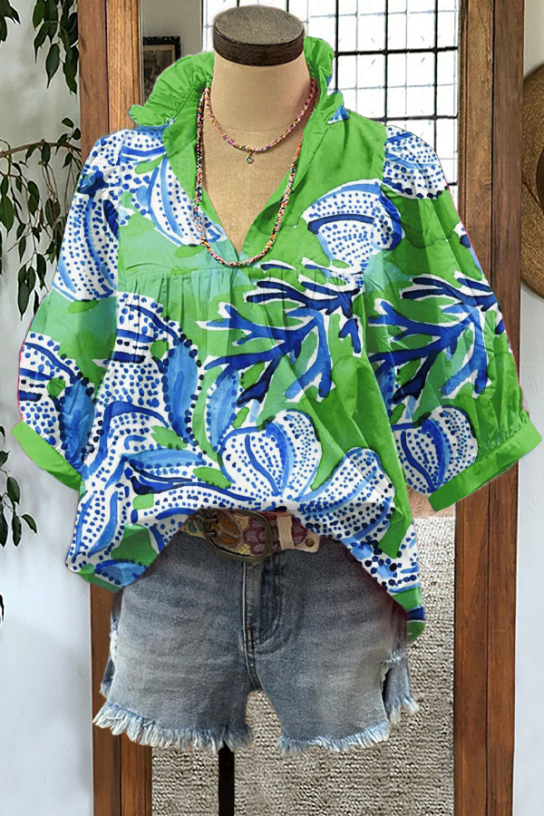 Stay on trend this season in our new classic, v neck top. We especially love the natural print fabric and think this piece will be a new favorite in your closet!