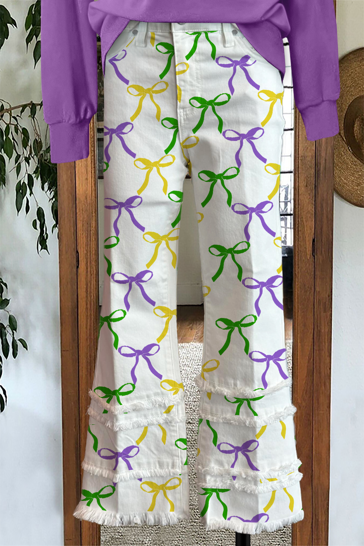 Mardi Gras Bow Print Raw Hem Pants
