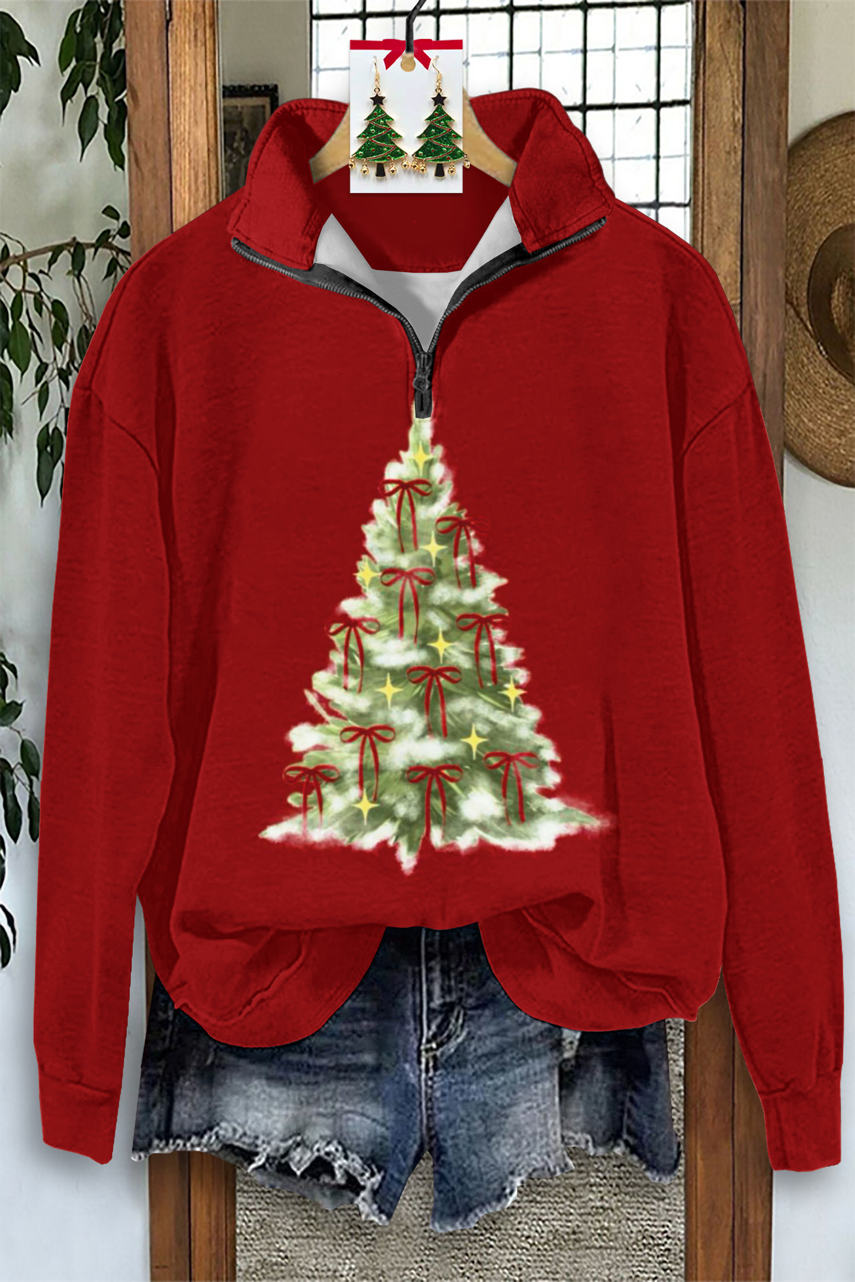 Classic Christmas Tree Bow Print Zip-Up Sweatshirt