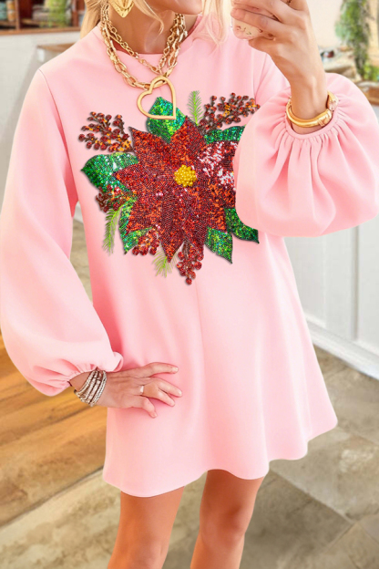 Christmas Sparkling Poinsettia Puff Sleeve Mini Dress