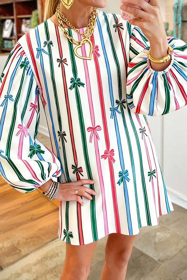 Colorful Striped Bow Puff Sleeve Mini Dress